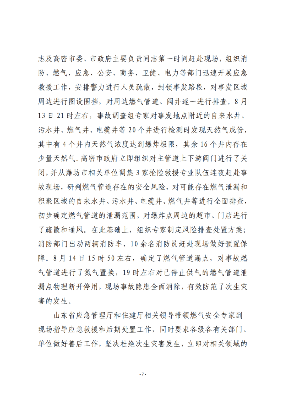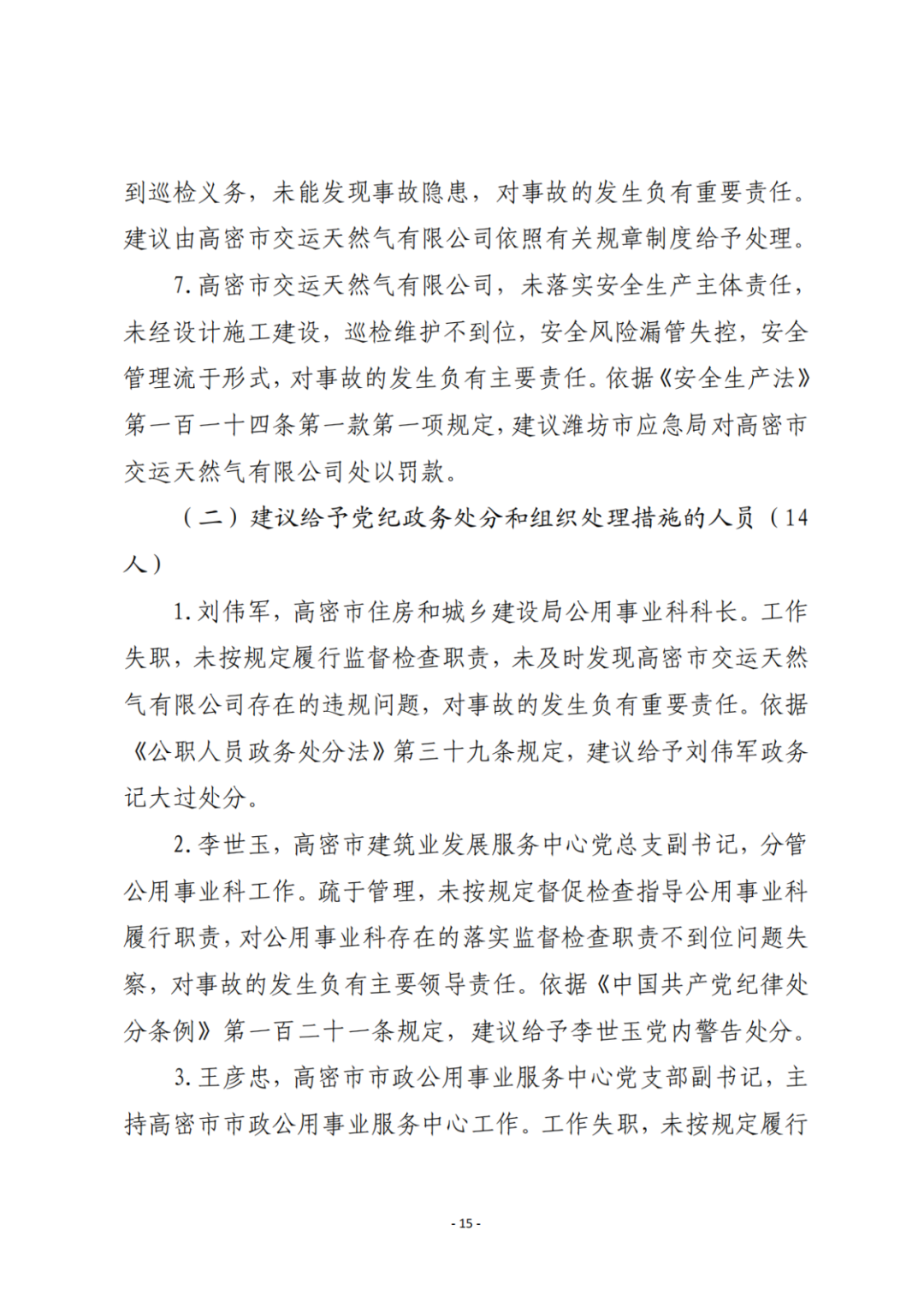 其中高密市交运天然气有限公司实际控制人栾林江,副经理、安全生产分管负责人李万敏,法定代表人、执行董事、经理栾林新,常务副经理李宏,安检部主任王森,安检部东片区步检员隋军等6人以及高密市交运天然气有限公司被建议移送司法机关追究刑事责任。