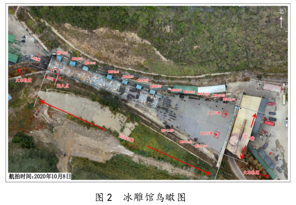2.总体结构情况。冰雕馆(见图2)项目位于台骀山游乐园西北处,依山谷而建,南北两侧为山体,东西长133.85m,东口宽32.8米、西口宽8.96米(东西口剖面图见图3、图4),高8.2米,总建筑面积为2258平方米。冰雕馆主体为钢架结构,南北两侧外墙4米以上用彩钢板围护,顶部为彩钢板封闭。内部喷涂约15厘米厚的聚氨酯作保温层,同时用约14厘米厚的聚苯乙烯夹芯彩钢板隔离成两个相对独立的部分,南侧为小火车通道,北侧为冰雕游览区(主体建筑一层、局部二层)。小火车通道照明线路均采用铰接方式连接,敷设在聚苯乙烯夹芯彩钢板上,并被聚氨酯保温材料覆盖。冰雕游览区共有5个安全出口(见图5),分别是东侧一楼入口、东侧二楼出口、西侧出口、南侧2个出口。小火车通道内有10个应急照明灯具、5具灭火器;冰雕游览区内有2个应急照明灯具,灭火器24具。