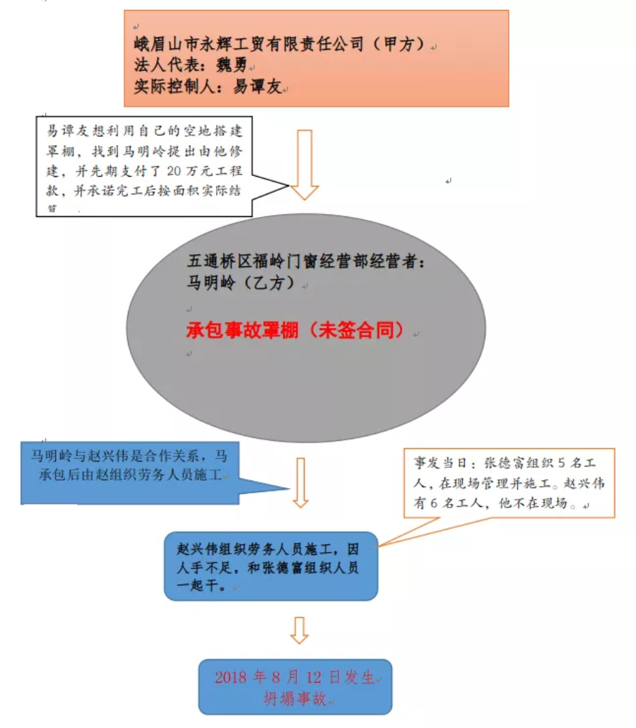 施工单位组织劳务人员在主体基本完工、集中堆载彩钢瓦的罩棚桁架上方作业(铺装彩钢瓦、进行檩条焊接),由于罩棚自身结构体系不合理,施工工艺和施工组织不科学,致使钢立柱偏心受压,桁架结构失稳,钢柱下无有效连接,预埋钢筋受剪脆断导致倾覆,造成局部坍塌,使未采取任何安全防护措施的7名作业人员从约13米高处坠落,酿成伤亡事故。1.事故罩棚的施工单位(乐山市五通桥区福岭门窗经营部):无资质承揽该罩棚建设工程,安全生产管理不力,盲目组织冒险施工,是事故发生的主要间接原因。2.事故罩棚业主单位(峨眉山市永辉工贸有限责任公司):没有履行安全生产主体责任,对施工单位安全生产监督管理不力,是发生事故的重要间接原因。3.属地政府和行业管理部门安全生产红线意识不强,对安全生产工作重视不够,属地监管责任落实不到位,也是事故发生的间接原因。1. 2018年5月,永辉公司实际控制人易谭友找到乐山市五通桥区福岭门窗经营部负责人马明岭,提出修建永辉公司的罩棚,并提前支付了马明岭20万元工程款,双方无书面合同。2. 2018年8月11日主体结构已基本完工,剩余工程就是铺装彩钢瓦和透明玻璃纤维瓦。3. 2018年8月12日上午马明岭租用的吊车,将约90片彩钢瓦和30片透明玻璃纤维瓦从地面全部吊装上罩棚钢质桁架上。4. 2018年8月12日下午1:30左右,施工现场管理人员张德富带领11名工人上班,分成了3个小队,其中2人在地面作业,7人在罩棚顶端铺装彩钢瓦和焊接檩条,3人在另一作业点,大约3:40分,现场作业人员在已经完成主体结构的钢质桁架上铺装彩钢板和焊接檩条作业时,东南向4榀桁架局部坍塌,致使7名作业工人从高处坠落,造成1人当场死亡,6人受伤。1.对峨眉山市乐都镇安办工作人员龚永旭政务立案,并给予政务警告处分;2.对峨眉山市乐都镇党委委员,分管安全、违建工作副镇长李庆政务立案,并给予政务警告处分;3.对峨眉山市乐都镇党委副书记、镇长邓劲松书面诫勉;4.对峨眉山市经信局能源安全股股长姚世明政务立案,并给予政务警告处分;5.对峨眉山市经信局分管安全生产工作副局长熊蔚书面诫勉;3.张德富:劳务作业人员组织者,现场管理(施工)人员。对施工现场管理不力,施工人员不戴安全帽,组织的高处作业、焊接作业人员无证上岗,不佩戴安全带。违章指挥,现场管理混乱,凭经验、按习惯施工,桁架严重承载;因其在事故中受重伤,深度昏迷,后于8月23日死亡,调查组未能对其进行谈话调查,建议不对其作出处理。1.责成乐都镇政府向峨眉山市人民政府作出书面检查;2.责成峨眉山市委、市政府向乐山市委、市政府作出书面检查。