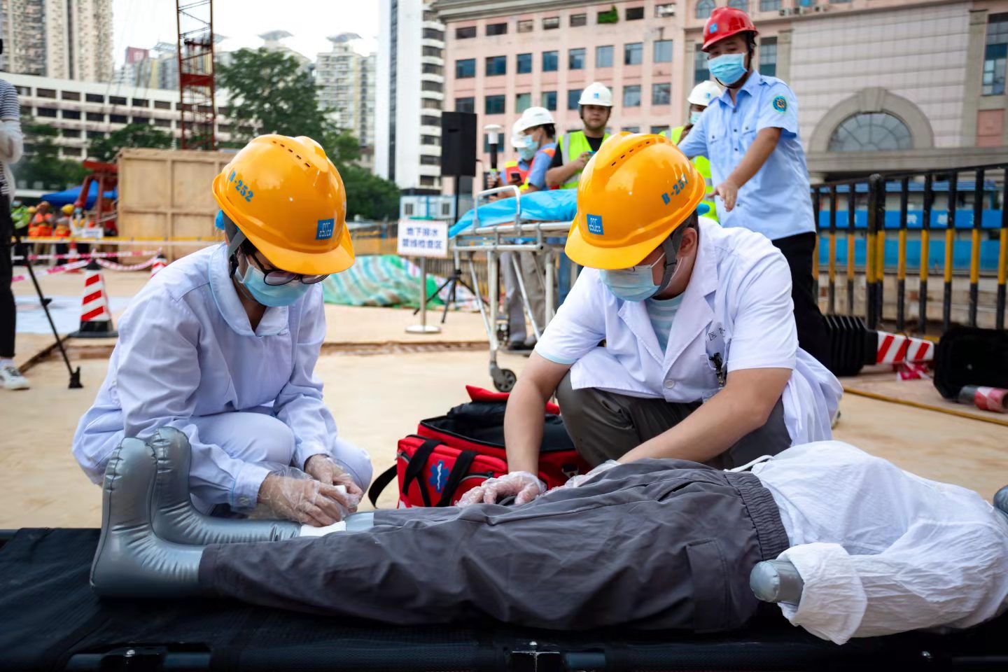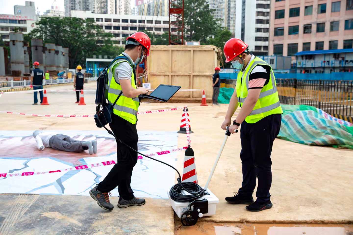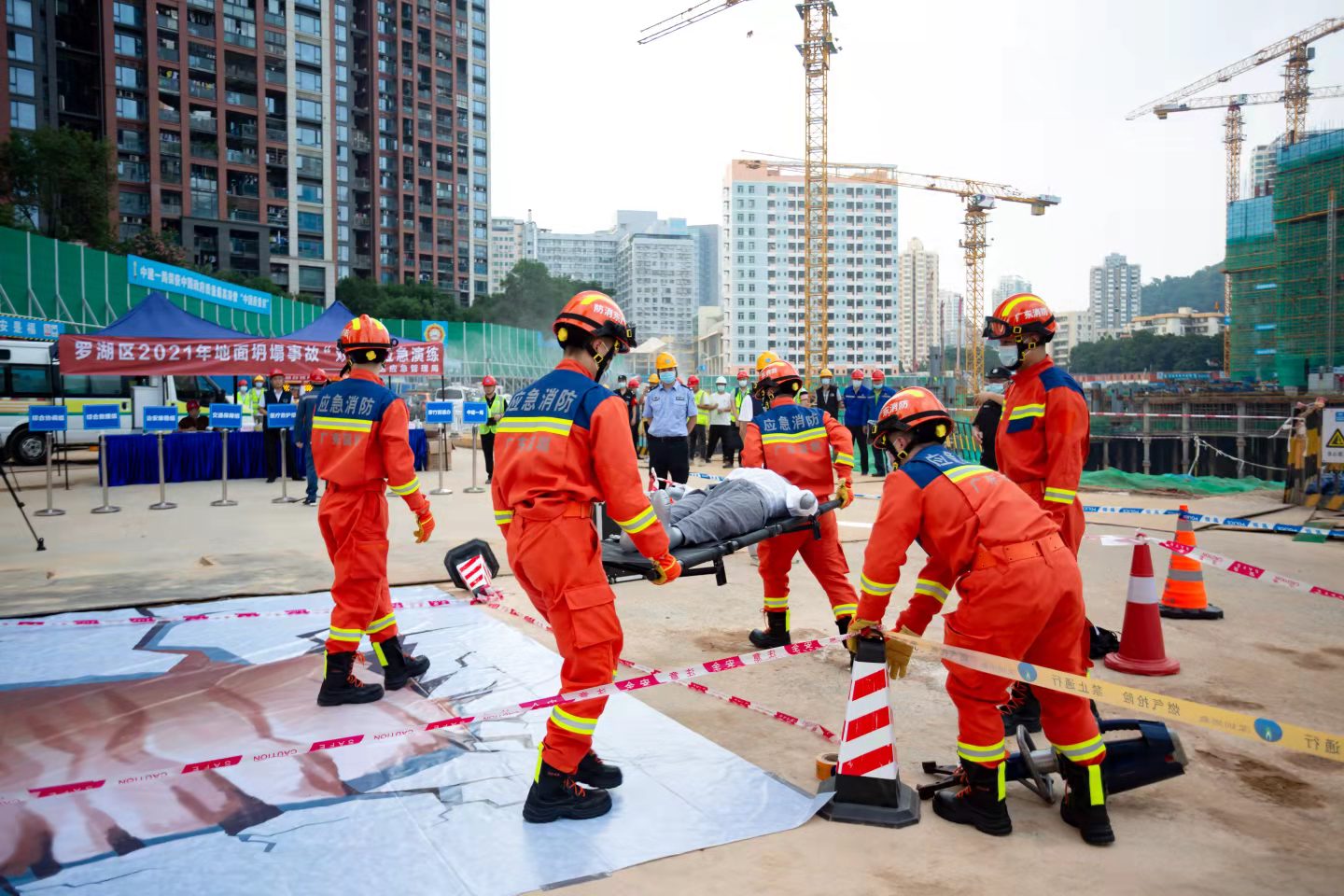 演练现场,各单位各司其职,有序开展各项救援工作。其中,罗湖区应急管理局担任现场应急指挥重任,翠竹街道办疏散现场群众,罗湖公安分局民警管控现场治安,罗湖交警大队交警管制并疏导现场道路交通,罗湖消防救援大队赶赴现场救援受困人员,区卫健救援队则救治受伤人员,水务集团排查地下水排水管道隐患,供电救援队检测现场有无电路管线漏电,燃气集团携带燃气泄漏仪检测现场燃气泄漏情况,住建局检测周边房屋结构,地面坍塌应急救援技术支撑单位利用勘测雷达检测附近区域有无其他空洞。