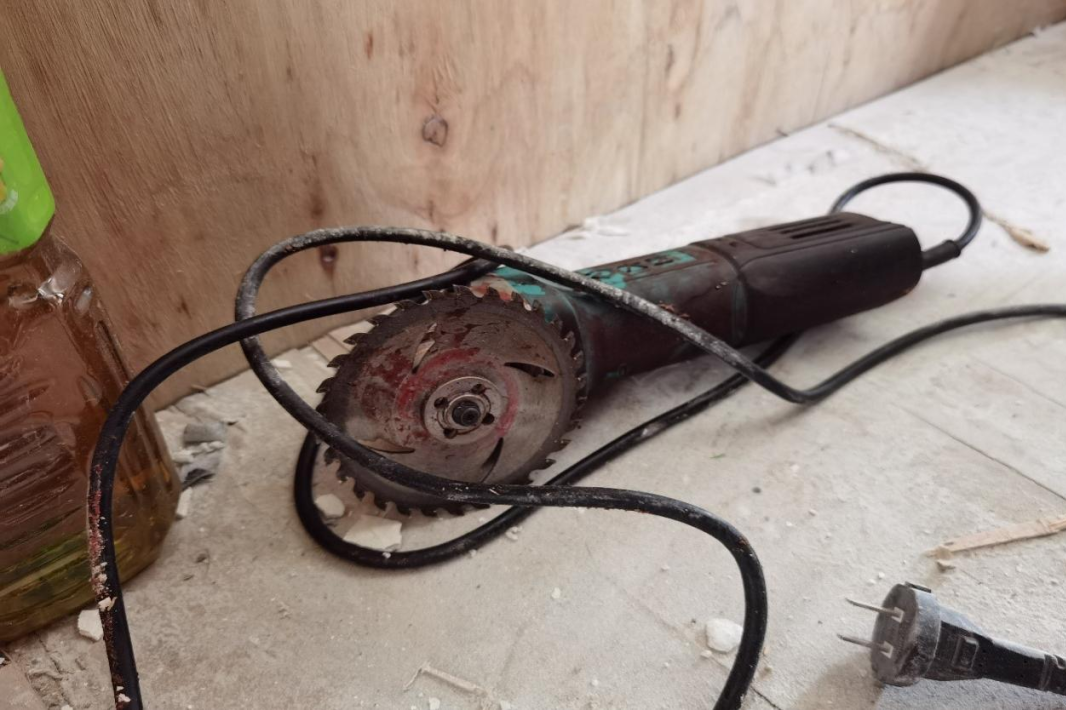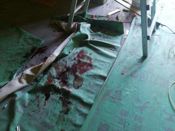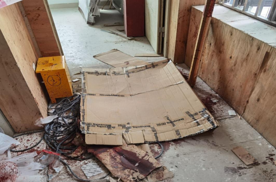 2021年9月10日11时许,深圳市某公司一工人在五楼房间使用角向磨光机(简称:角磨机)锯天花板木板时,被角磨机锯伤脖子,伤者已送院抢救,生命体征平稳。 ▲事故现场图片