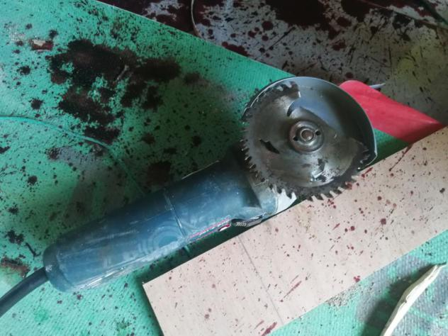 ▲角磨机安装了防护罩,锯片已残缺 ▲事故现场有大量血迹 ▲金属折叠梯上方的木板已开槽 案例二、工人被角磨机割伤,身亡! 2021年5月31日10时51分,深圳市某小区装修工程工地一工人使用角向磨光机切割木材时被高速旋转的锯片割伤,经抢救无效死亡。事故涉嫌使用安全防护装置(防护罩)缺失的角向磨光机切割木材。 ▲ 事发现场 ▲角向磨光机 案例三、不慎脱手弹飞,切到脖子! 惨烈!某员工使用角磨机切割物件,不慎脱手弹飞,直接切到脖子,命悬一线! 案例四、角磨机突然弹跳起来,工人身亡! 据了解,男子在使用手持砂轮切割机时,并未留意到切割机的开关处于打开状态。待男子插上电源后,切割机突然弹跳起来,割伤男子大腿。起初男子以为没有大碍,所以并未及时去医院就医。现初步怀疑是因失血过多,不治身亡!
