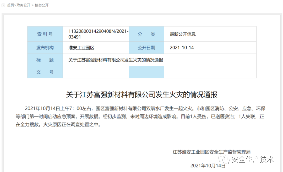 上午,江苏淮安工业园区安全生产监督管理局发布《关于江苏富强新材料有限公司发生火灾的情况通报》: