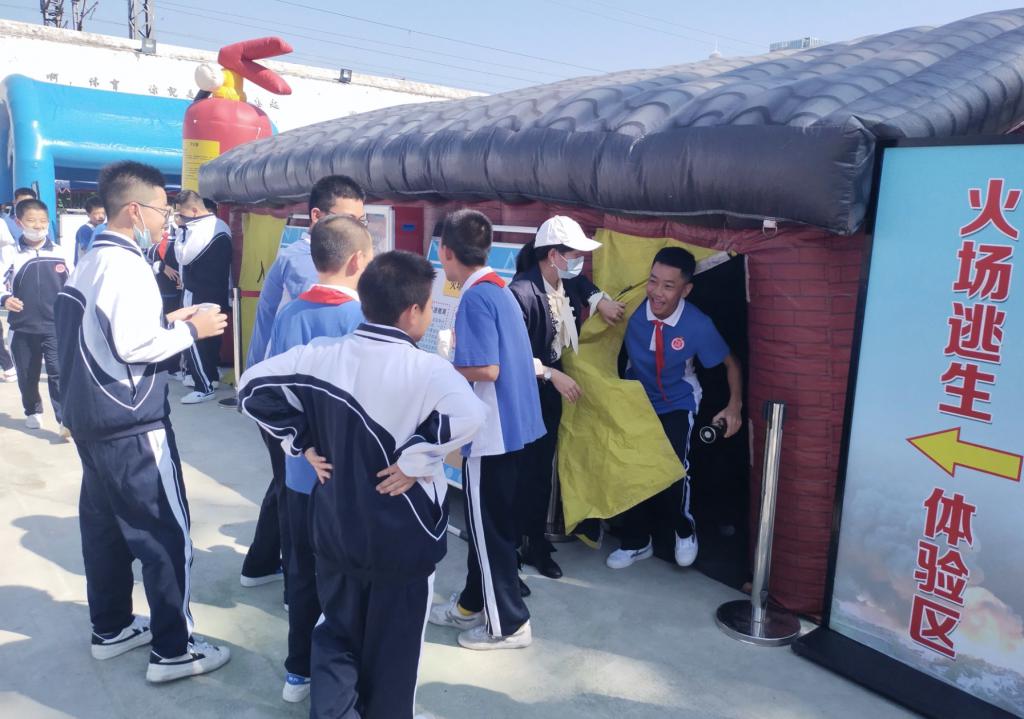 在随后的浓烟逃生体验中,学生们逐一进入烟雾缭绕的浓烟逃生体验屋内,他们顺着墙壁,一手湿毛巾捂鼻,一手向前摸着墙壁,按照安全疏散标识迅速逃生。通过浓烟逃生体验,学生们掌握正确的逃生方法,懂得了在火灾发生时要临危不乱,并如何更好地保护自身安全。