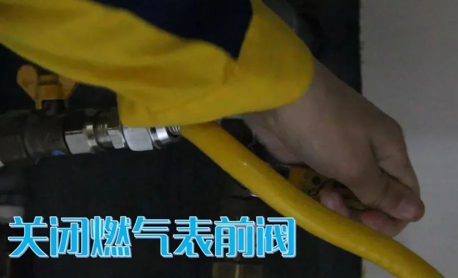 第一步:关闭燃气表前阀门,将手柄顺时针旋转90°,切断气源。