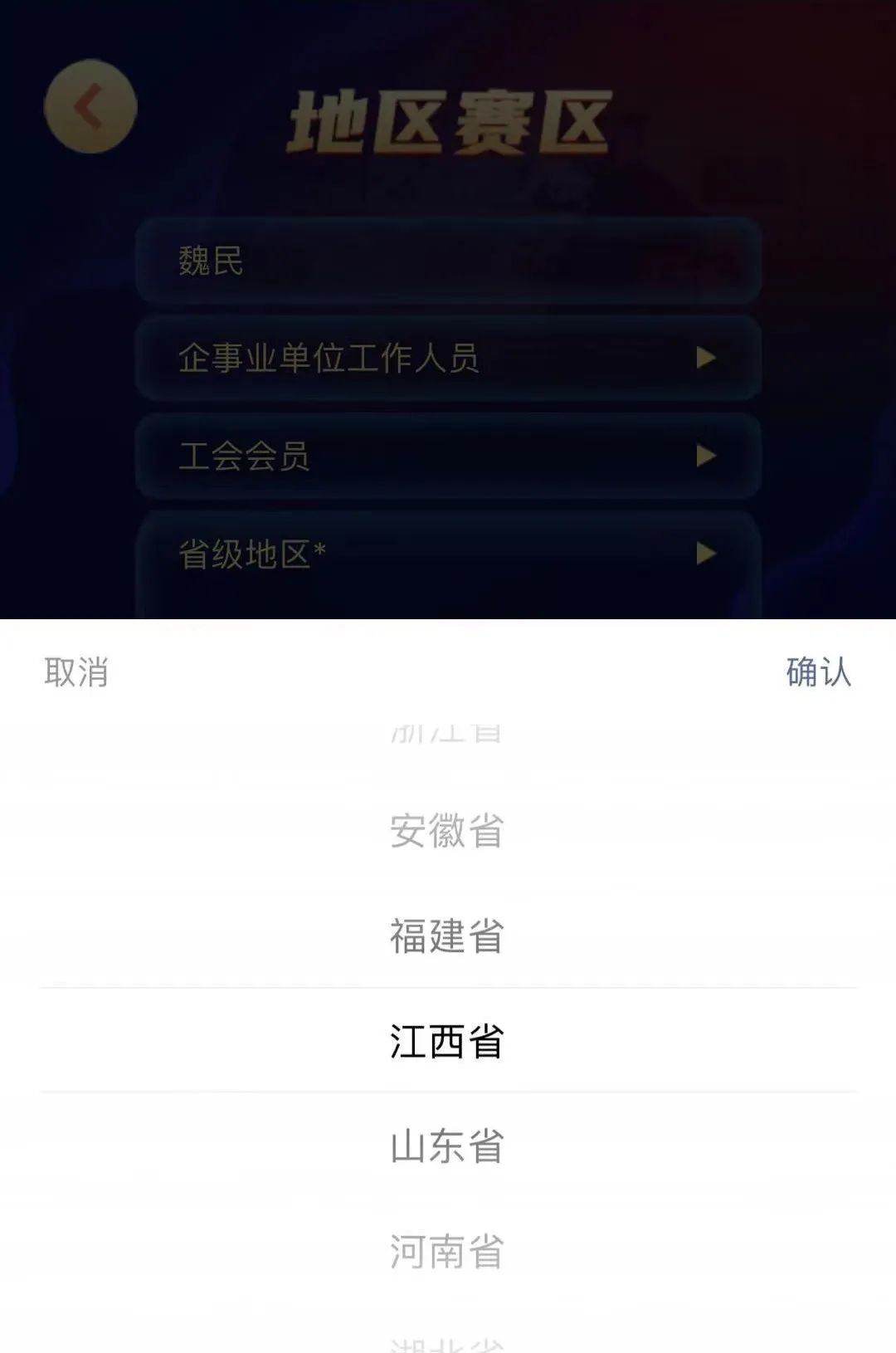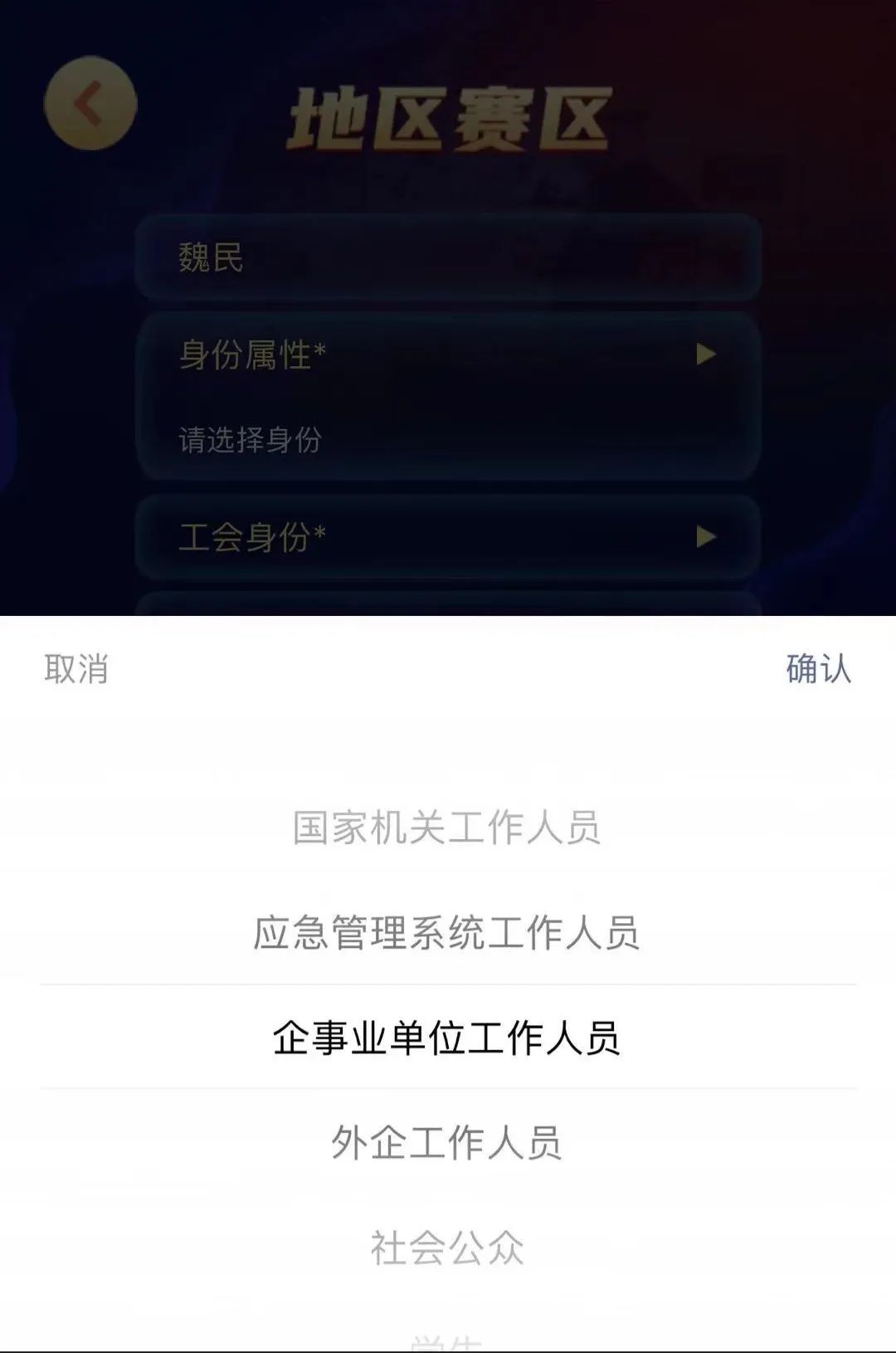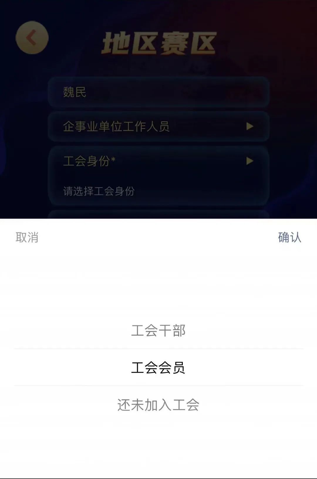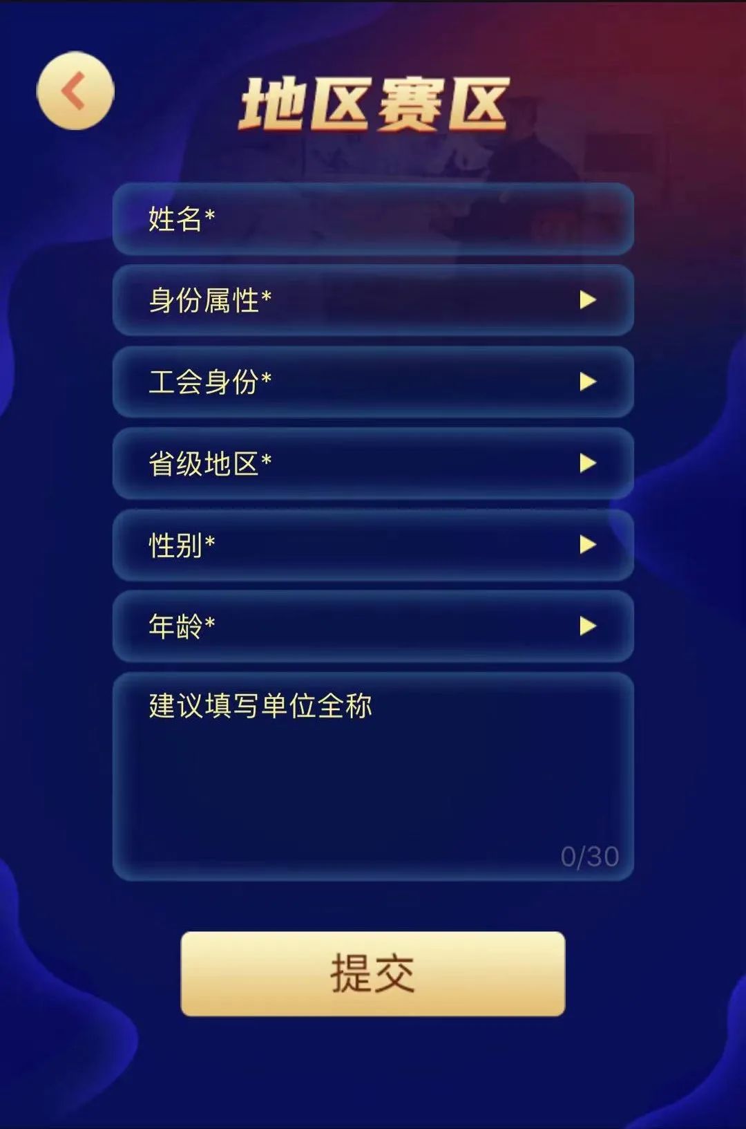必填报名项:姓名、身份属性、工会身份、地区/单位(根据所在赛区填写)、性别、年龄。
