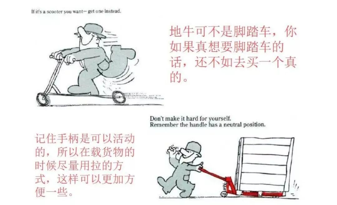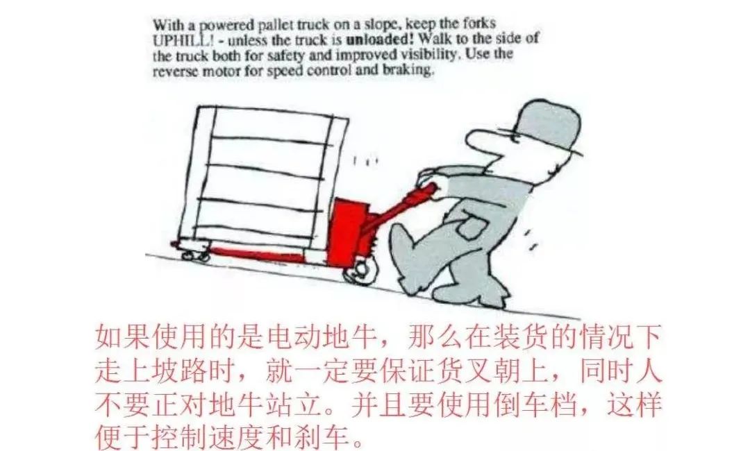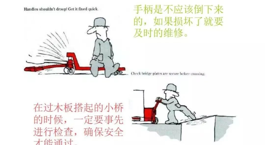 1. 打压 将控制手柄打到下位,按下方向柄,即可对叉车进行打压,所叉货物重量严禁超过叉车所限重量;2. 拉货 打压将货物离地后,将控制手柄打到中位,即可拖动货物,在拉货时不可奔跑,需缓行;3. 卸压 将货物拉到目的地后,将控制手柄打到上位,对叉车进行卸压,直到货物着地;4. 空车运行 在空车运行时应将叉车适当打压升起以免前轮轴支撑架与地面接触磨损。1. 手动液压搬运车只能一人操作,多人操作时须由一人统一指挥;2. 手动液压搬运车在装载时,严禁超载、偏载及单叉作业,所载物品重量必须在搬运车允许负载范围内,请确保货叉长度大于等于货盘的长度;5. 手动液压搬运车叉必须完全放入货架下面,将货物叉起,保持货物的平稳后才能进行拉运;6. 严禁装载不稳定的或松散包装的货物,如若必要,须安排人员扶持;7. 手动液压搬运车在高物低载搬运过程中将货叉放到尽量低位置,以免货物摔落;8. 请勿将身体的任何部位放置于本车的机械提升部件附近、所载货物上以及货叉下方;9. 操作时严禁速度过快(不超过3公里/小时,成年人正常行走速度5公里/小时),转弯时减速;10. 严禁在倾斜的斜面或陡坡上操作手动液压搬运车,若须手动液压搬运车在斜坡上使用时,操作者不得站在手动液压叉车正前方,避免手动液压搬运车惯性导致速度过快失控撞人;11. 手动液压搬运车严禁载人或在滑坡上自由下滑;13. 请勿在泥泞、不平的地面上使用手动液压搬运车,手动液压搬运车在使用时,必须注意通道及环境,不能撞及他人、设备和其他物品;14. 手动液压搬运车不用时,必须空载降低货叉到最低位置,且存放在规定的地方;15. 手动液压搬运车使用人员须定期保养,部门管理人员须定期安排检修或维修;16. 损坏的手动液压搬运车必须进行维修或报废,禁止手动液压搬运车带病工作。1. 支架及紧固件: 把松的轮轴与螺母上紧并检查焊缝或支撑板有否损坏,插杆型脚轮应上紧螺母或牢固铆紧并保证设备安装支架没有弯折,安装脚轮时应使用锁紧螺母或防松垫片;2. 润滑: 定期加润滑油,把润滑脂涂于轮轴、密封圈内和滚柱轴承的摩擦部位,以减少摩擦并令转动更灵活;3. 脚轮: 目视检查脚轮磨损情况,检查脚轮转动正常,无杂物缠绕或脚轮的过松或过紧,更换破损的脚轮以避免不稳定的转动,检查和更换脚轮之后,须保证用锁紧垫片和螺母上紧轮轴(因为轮轴松动会导致轮幅与支架摩擦并卡死)。