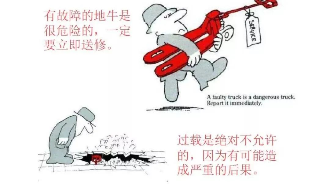 正是由于起重尾板区域装卸作业有如此多的不安全因素才导致事故多发。1、作业现场其他人员没有与叉车保持安全距离时必须立即停止作业;3、叉车停止作业下车时,必须熄火、拔钥匙、拉手刹;4、每日始业前,必须按照点检内容进行仔细点检方可作业;5、叉车作业过程中发现异常必须遵守“停呼等”的原则。7. 不准在货叉、货盘上站人作业,起升货物后,货叉下严禁站人;10. 不准超速,在仓库内载物行驶限速5KM/h;1. 远离叉车作业区(包括料架集中摆放区),具体为:(3)配合供应商进行零部件确认、检查时,不要图方便,进行叉车作业区。(1)通过交叉路口或横过叉车通道时,做好点指确认;(2)仓库内行走时,不要边走边打电话,或做其他影响注意力的事情;(1)动车前,确认车辆的前后左右无人员,特别是周围有障碍物时;(2 )行车时,不超速,转弯时减速,进行点指确认;(3)货架、料框等有缺陷时,或摆放不稳固时,严禁使用;