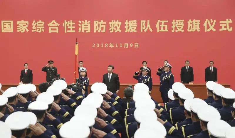 2018年11月9日,国家综合性消防救援队伍授旗仪式在人民大会堂举行。习近平总书记向国家综合性消防救援队伍授旗并致训词。 国家消防救援队伍要对党忠诚、纪律严明、赴汤蹈火、竭诚为民,在人民群众最需要的时候冲锋在前,救民于水火,助民于危难,给人民以力量,为维护人民群众生命财产安全而英勇奋斗。 ——2018年11月9日,向国家综合性消防救援队伍授旗并致训词 长期以来,消防队伍作为同老百姓贴得最近、联系最紧的队伍,有警必出、闻警即动,奋战在人民群众最需要的地方,特别是在重大灾害事故面前,你们不畏艰险、冲锋在前,作出了突出贡献。改革转制后,你们作为应急救援的主力军和国家队,承担着防范化解重大安全风险、应对处置各类灾害事故的重要职责,党和人民对你们寄予厚望。 ——2018年11月9日,向国家综合性消防救援队伍授旗并致训词 要加强应急救援队伍建设,建设一支专常兼备、反应灵敏、作风过硬、本领高强的应急救援队伍。要采取多种措施加强国家综合性救援力量建设,采取与地方专业队伍、志愿者队伍相结合和建立共训共练、救援合作机制等方式,发挥好各方面力量作用。要强化应急救援队伍战斗力建设,抓紧补短板、强弱项,提高各类灾害事故救援能力。 ——2019年11月29日,在十九届中央政治局第十九次集体学习时的讲话 应急管理部门全年365天、每天24小时都应急值守,随时可能面对极端情况和生死考验。应急救援队伍全体指战员要做到对党忠诚、纪律严明、赴汤蹈火、竭诚为民,成为党和人民信得过的力量。应急管理具有高负荷、高压力、高风险的特点,应急救援队伍奉献很多、牺牲很大,各方面要关心支持这支队伍,提升职业荣誉感和吸引力。 ——2019年11月29日,在十九届中央政治局第十九次集体学习时的讲话 10月28日,参加首届全国消防行业职业技能大赛决赛的消防队员在比赛中。如今,国家综合性消防救援队伍加速转型升级,新组建水域、山岳、地震、空勤等专业队3000余支,建设“10+2”森林消防综合应急救援拳头力量;各类应急救援专业力量也在壮大,已建成地震、矿山、危险化学品、航空救援等国家级应急救援队伍近100支2万余人,发展社会应急救援力量62万余人。初步构建起以国家综合性消防救援队伍为主力、以专业救援队伍为协同、以军队应急力量为突击、以社会力量为辅助的中国特色应急救援力量体系。