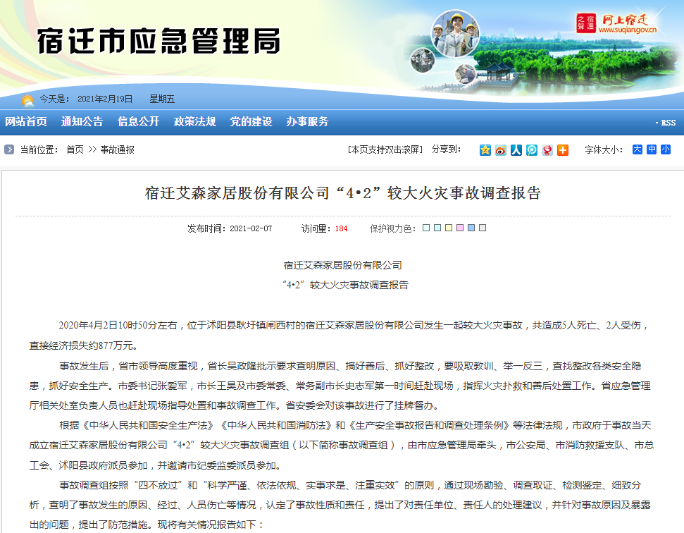 2020年4月2日10时50分左右,位于江苏沭阳县耿圩镇闸西村的宿迁艾森家居股份有限公司发生一起较大火灾事故,共造成5人死亡、2人受伤,直接经济损失约877万元。近日,宿迁市应急管理局公布了该起事故调查报告。