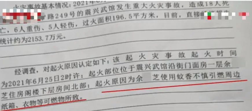 火灾认定书说:这起火灾导致18人死亡,6人重伤,5人轻伤,过火面积196.5平方米,直接 经济损失2153.7万元。起火部位位于震兴武馆沿街门面一层余某芝住房阁楼下层房间北部,起火原因为余某芝使用蚊香不慎引燃周边纸箱、衣物等可燃物所致。