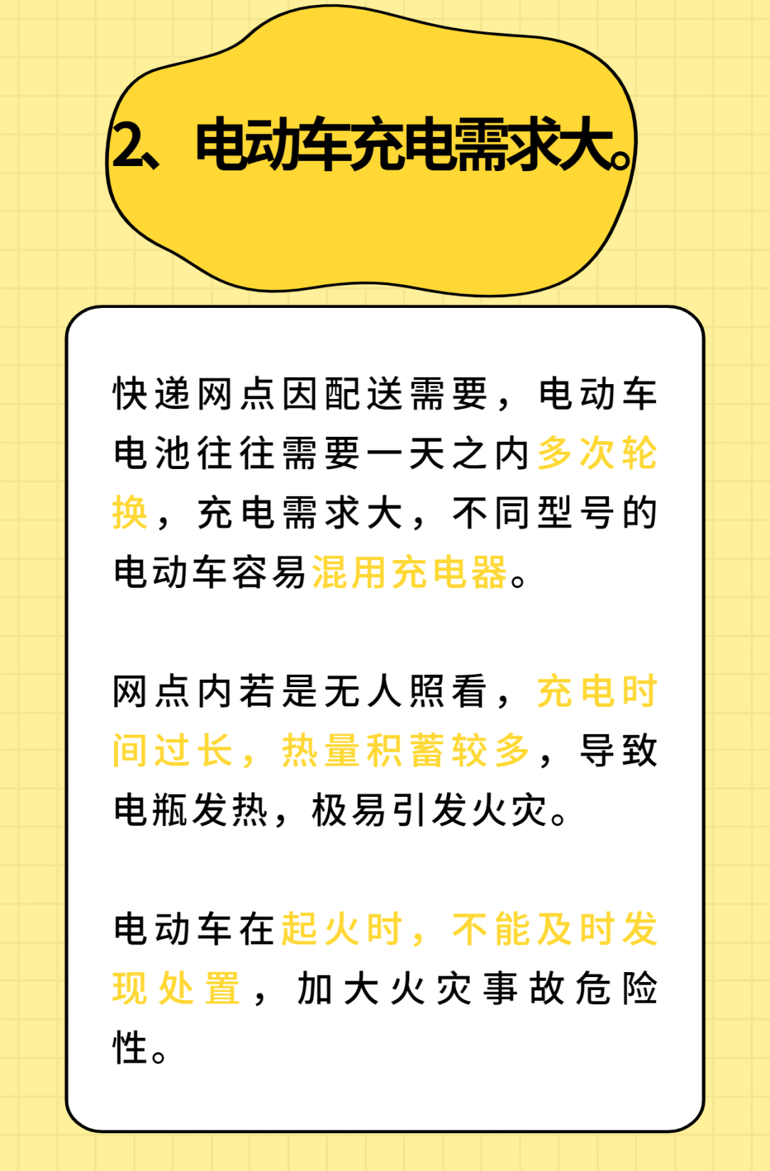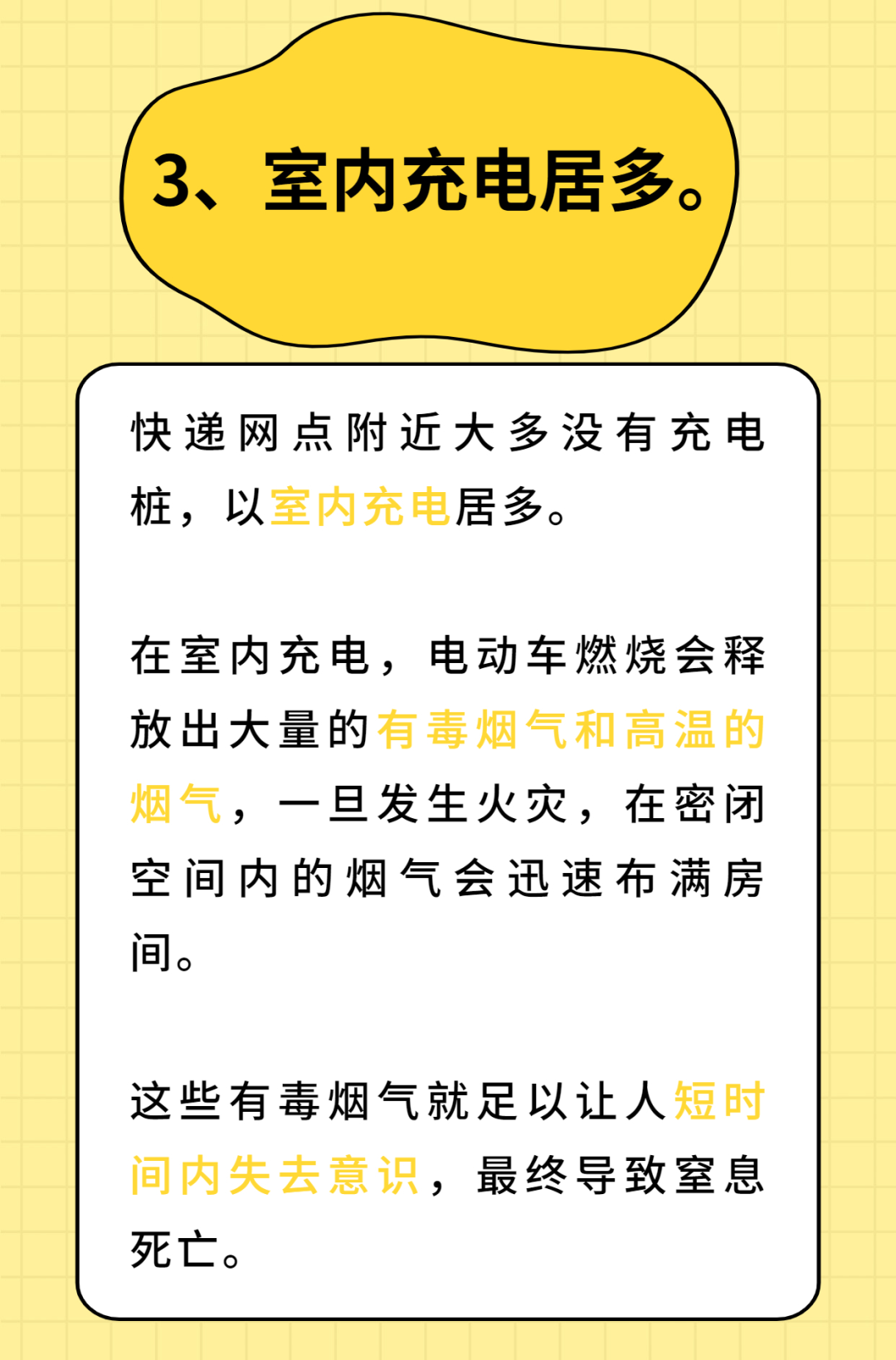 2019年12月24日晚上23时43分,鼓楼区一处快递仓库有烟冒出,疑似发生火灾。事后,消防人员在调查中发现,这场火灾是3辆电瓶车过载充电自燃所致!快递员小吴和同事前一天晚上忙到夜里十点多才下班,因为下雨就把电动车停放在店内充电,自己便下班回家了,没想到竟然引发了火灾。