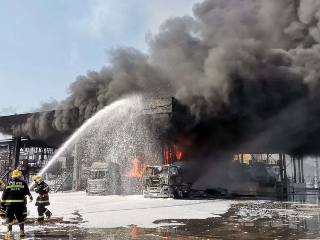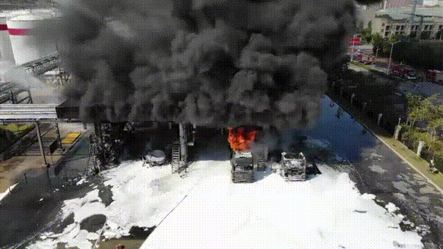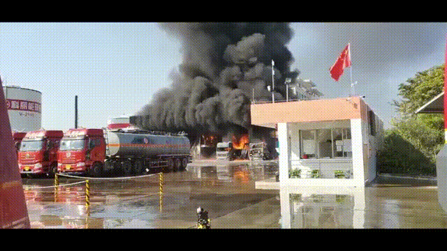 消防员到场后侦查发现,起火油罐车火势蔓延,引燃了旁边正在作业的另2辆油罐车,火势处于猛烈燃烧阶段,浓烟弥漫。