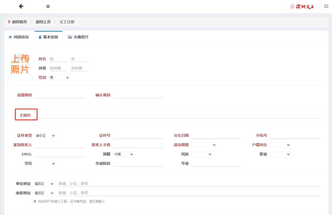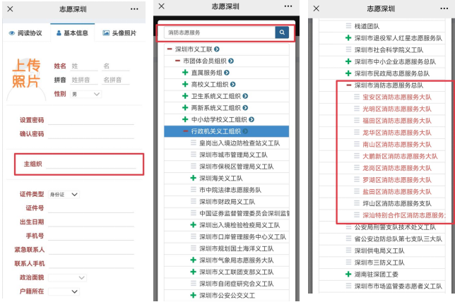 二、填写基本信息,点击“主组织”,搜索“消防志愿服务”,找到“深圳市消防志愿服务总队”,根据常住地或工作地选择对应区域消防志愿服务大队“XX区消防志愿服务大队”,完成注册。