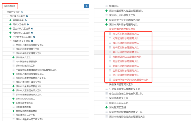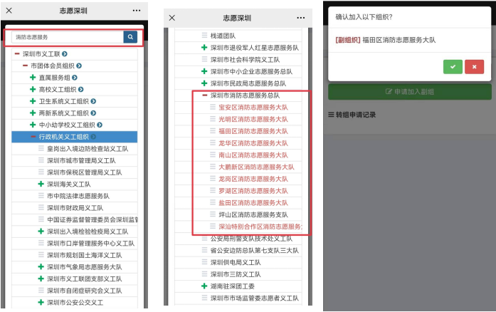 搜索“消防志愿服务”,找到“深圳市消防志愿服务总队”,选择“XX区消防志愿服务大队”,点击“”确认加入副组织。