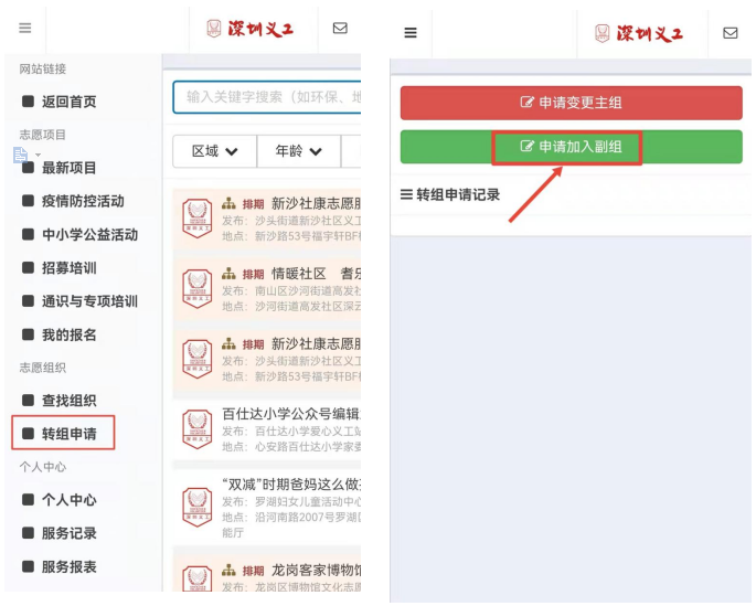 登录“志愿深圳”系统,点击“转组申请”,选择“申请加入副组织”。