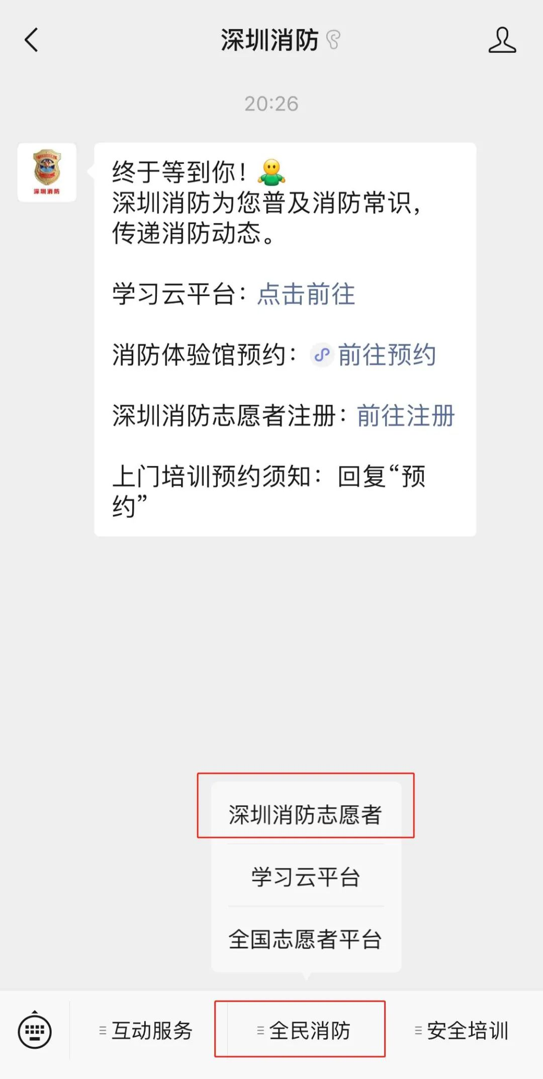 ▲方法一:关注“深圳消防”微信公众号注册,点击“全民消防-深圳消防志愿者”。
