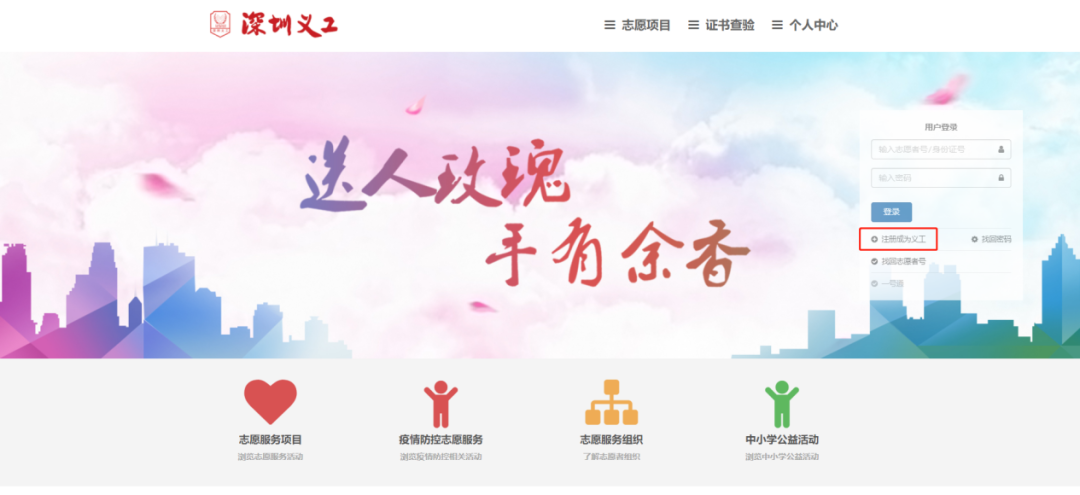 ▲方法二:网页注册,登录志愿深圳平台,选择“注册成为义工”。