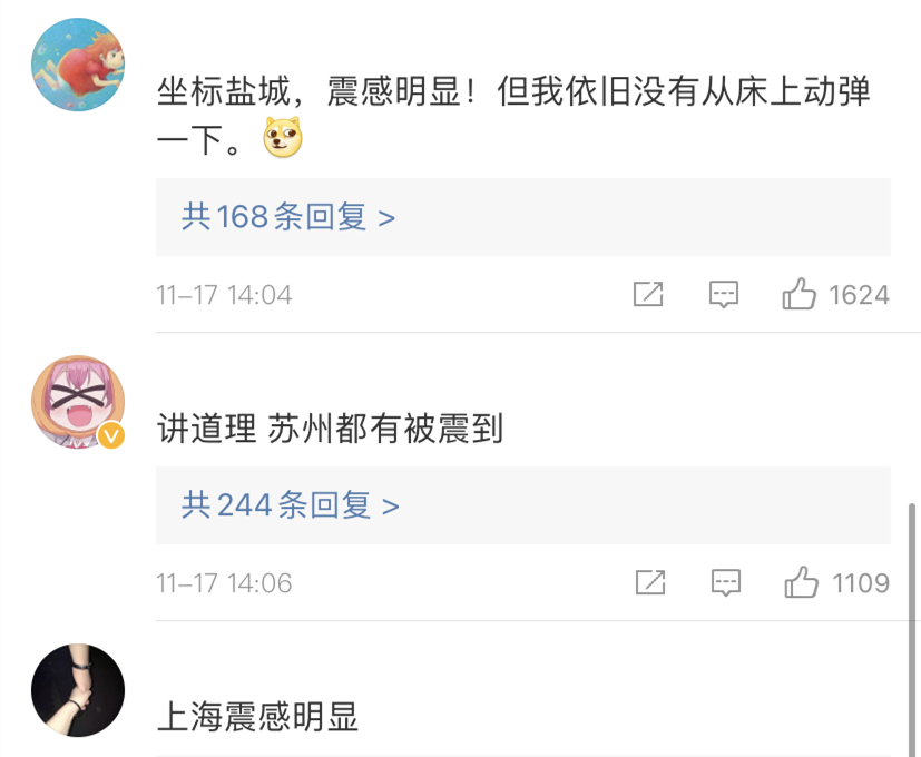 11月17日13时54分在江苏盐城市大丰区海域(北纬33.50度,东经121.19度)发生5.0级地震,震源深度17千米。