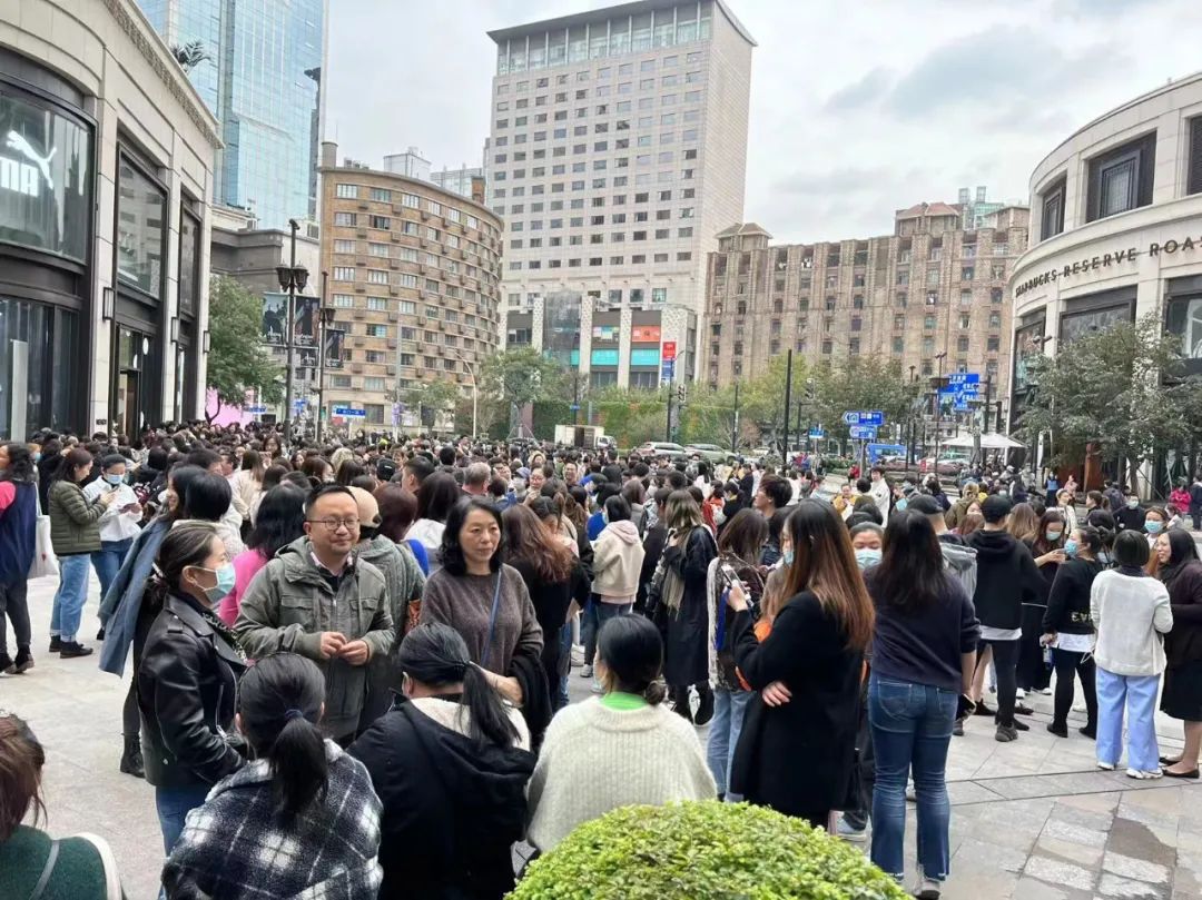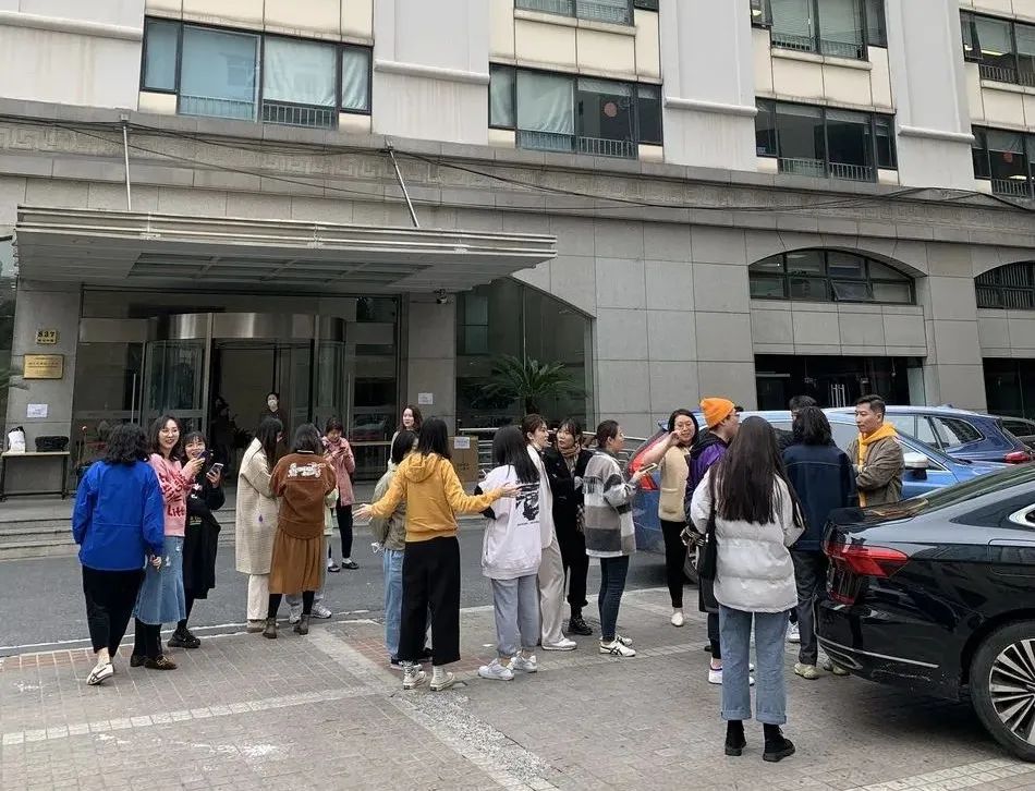 2021年11月17日,上海延安中路附近办公楼,办公人员在室外避险