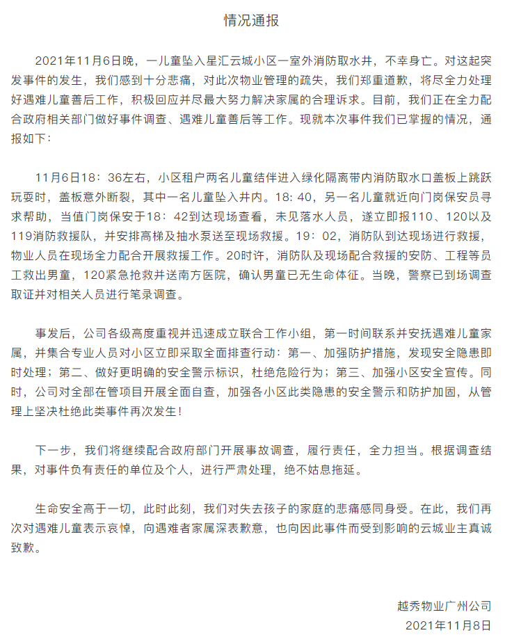 11月9日,为事发小区提供物业服务的越秀物业广州公司,就“男孩坠深井溺亡”事故发文。
