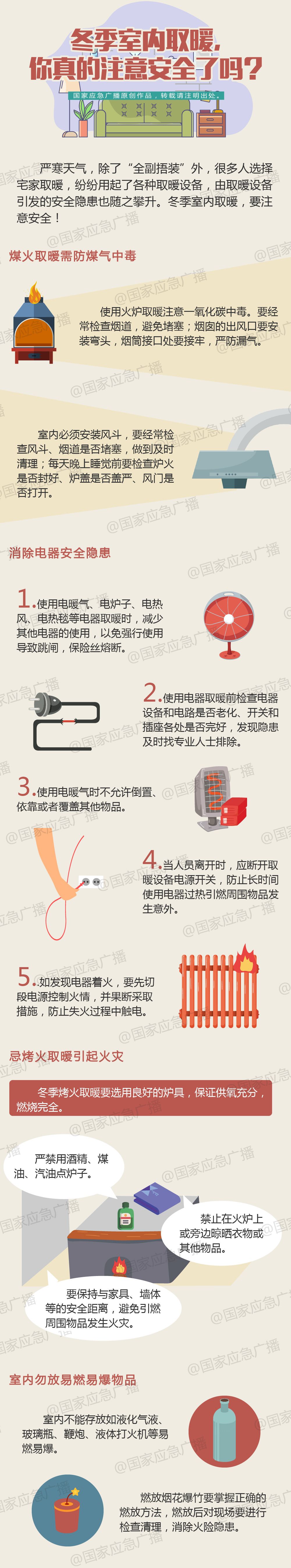 严寒天气,除了“全副捂装”外,很多人选择宅家取暖,纷纷用起了各种取暖设备,由取暖设备引发的安全隐患也随之攀升。冬季室内取暖,要注意安全!