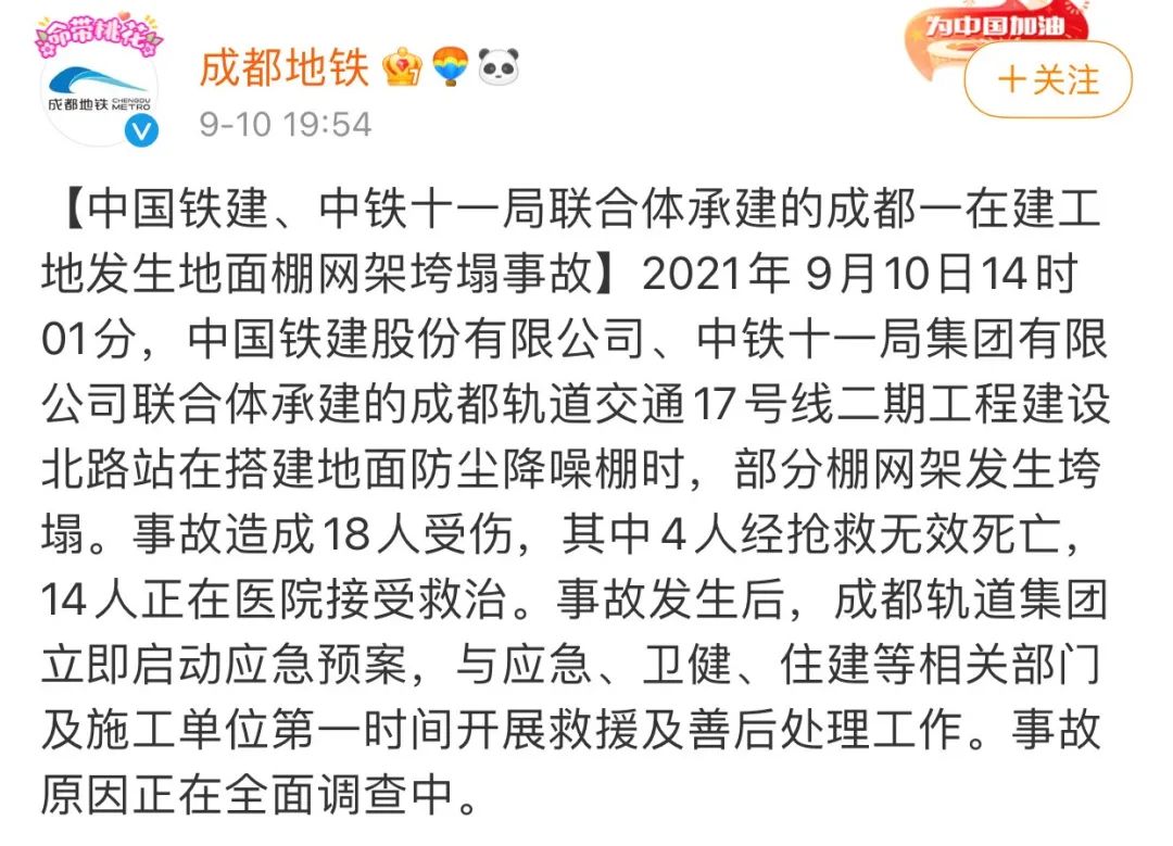 2021年9月10日晚,成都轨道集团就成都地铁17号线二期工程垮塌事故发布官方通报,通报称,2021年9月10日14时01分,成都轨道交通17号线二期工程建设北路站在搭建地面防尘降噪棚时,部分棚网架发生垮塌。事故造成18人受伤,其中4人经抢救无效死亡。