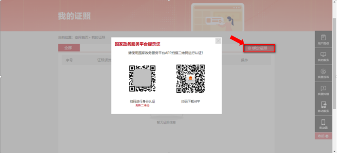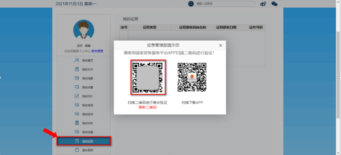 登录后返回首页,点击“用户名”进入用户中心页面。在用户中心点击“我的证照”栏目查看特种作业操作证,需要先进行实人身份认证。可以使用国家政务服务平台APP扫描左侧二维码进行人脸识别认证,无国家政务服务平台APP的,扫描右侧二维码下载。