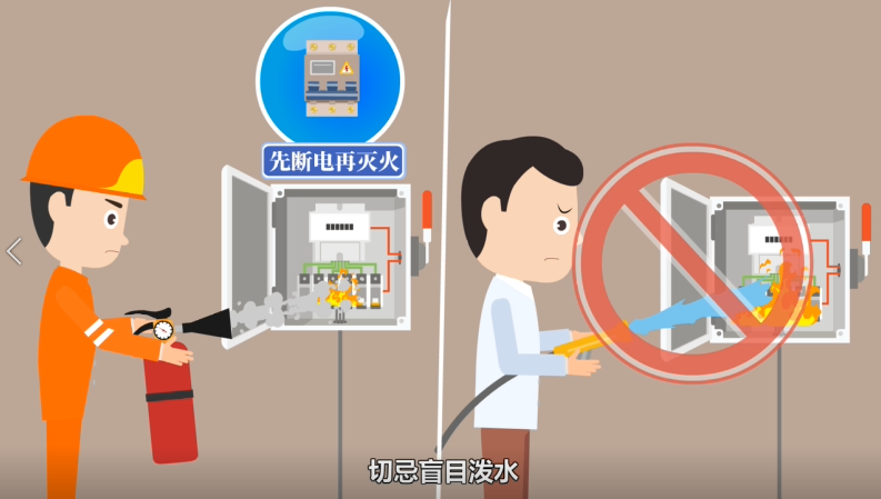 〢如遇电气火灾,要谨记先断电、再灭火,切忌盲目泼水。