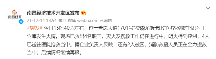 18时54分,@南昌经济技术开发区发布 通报称,12月14日15时40分左右,位于青岚大道1701号“费森尤斯卡比”医疗器械有限公司一仓库发生火情。现场已救出4名职工,灭火及搜救工作仍在进行中,明火得到控制,4人已送往医院抢救当中。据企业负责人反映,还有2人被困,消防救援人员正在全力搜救当中,后续情况继续再报。