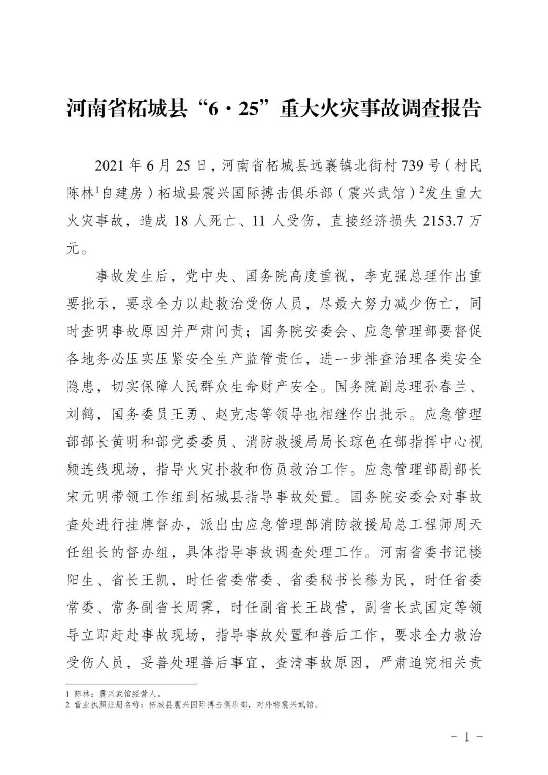 2021年6月25日,河南省柘城县震兴武馆发生重大火灾事故,造成18人死亡、11人受伤,直接经济损失2153.7万元