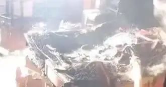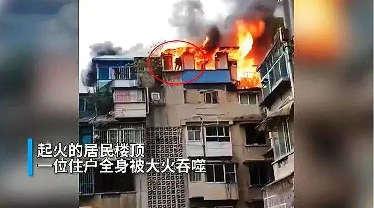 从画面中可以看到,事发地在一栋老式居民楼内,居民楼顶楼火势最大,现场浓烟滚滚。一名老人已被大火吞噬,全身着火, 为避火其从顶楼8楼一窗户处跳下。