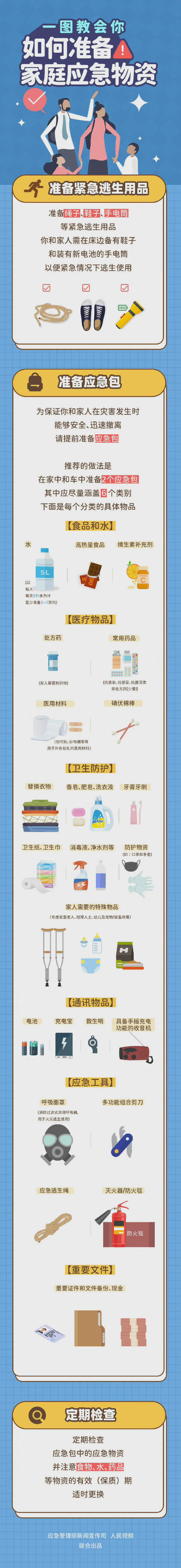 你的家中常备急救包吗?当居家生活中遇到地震、火灾、洪水等突发情况,一声哨响,就可以让救援人员及时找到你;一瓶碘伏棉棒,可以帮你迅速处理伤口……日常居家我们应该准备哪些应急物资?赶紧来看看这份清单,看图了解↓