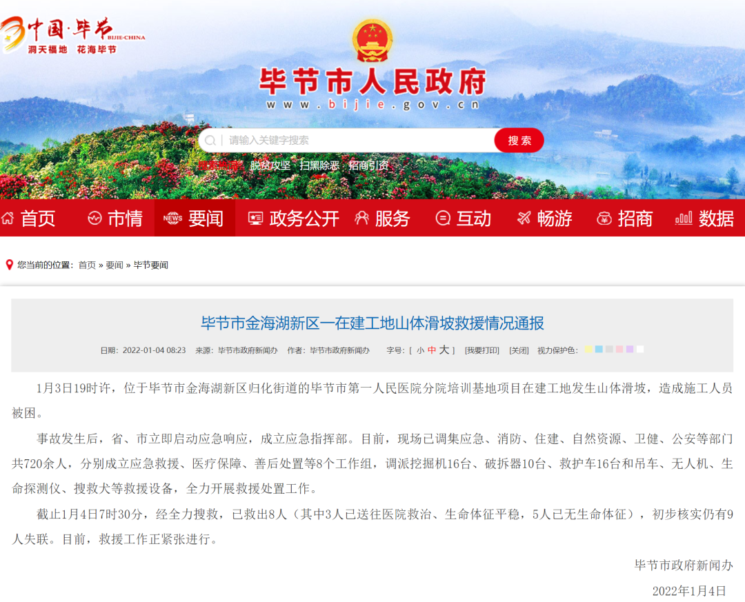 据毕节市政府网消息,经相关部门全力搜救,截至1月4日14时05分,毕节市金海湖新区一在建工地山体滑坡17名失联人员已全部找到,其中3名伤者已第一时间送往医院抢救,生命体征平稳。其余14人已无生命体征。