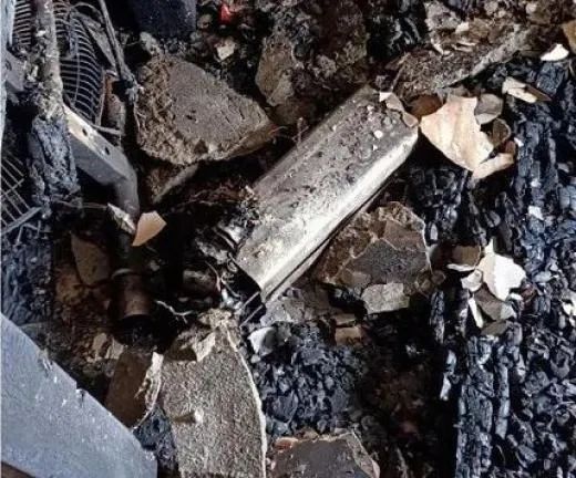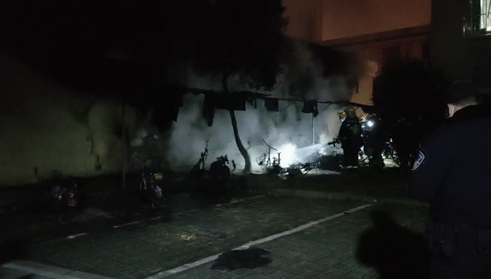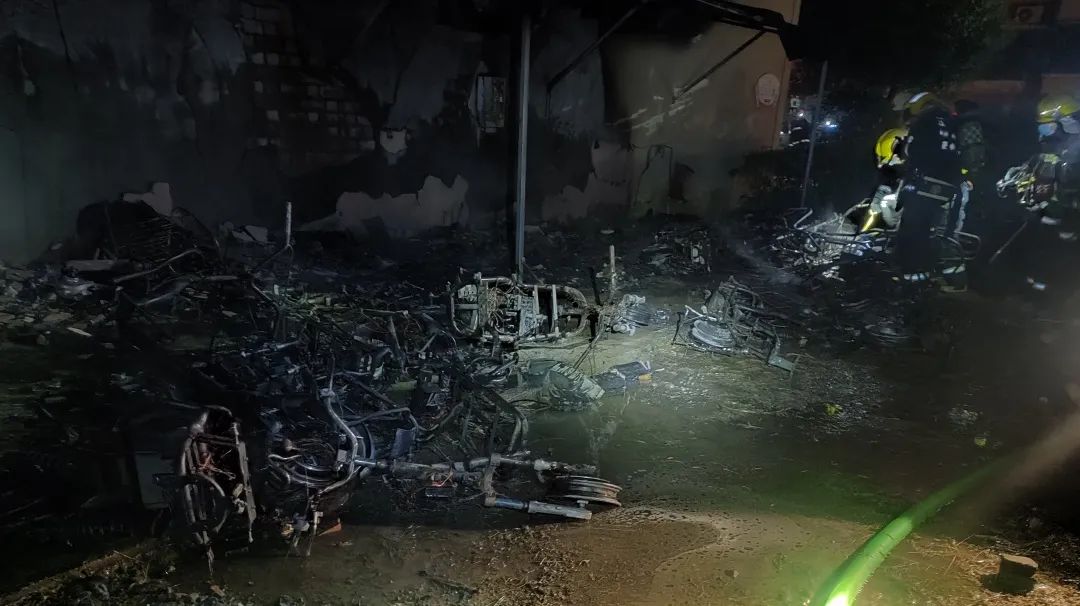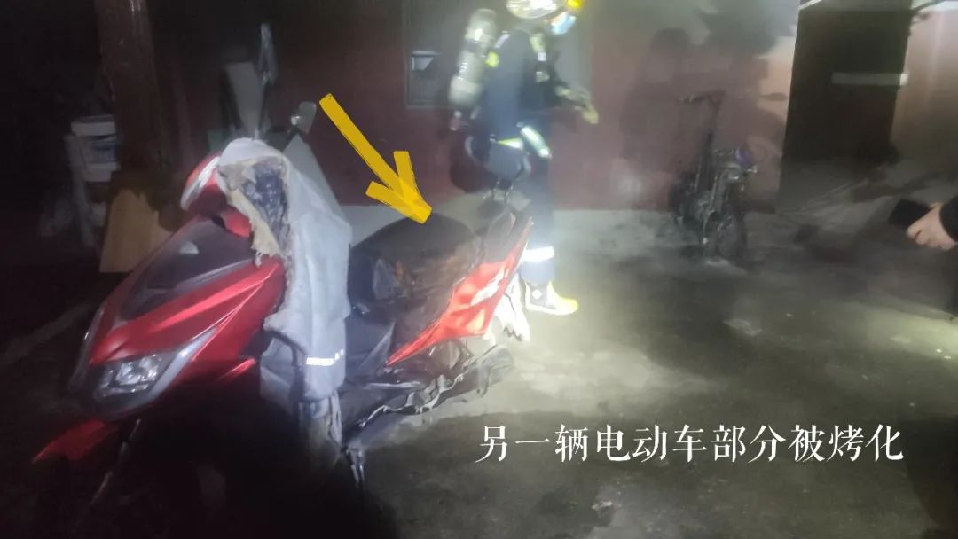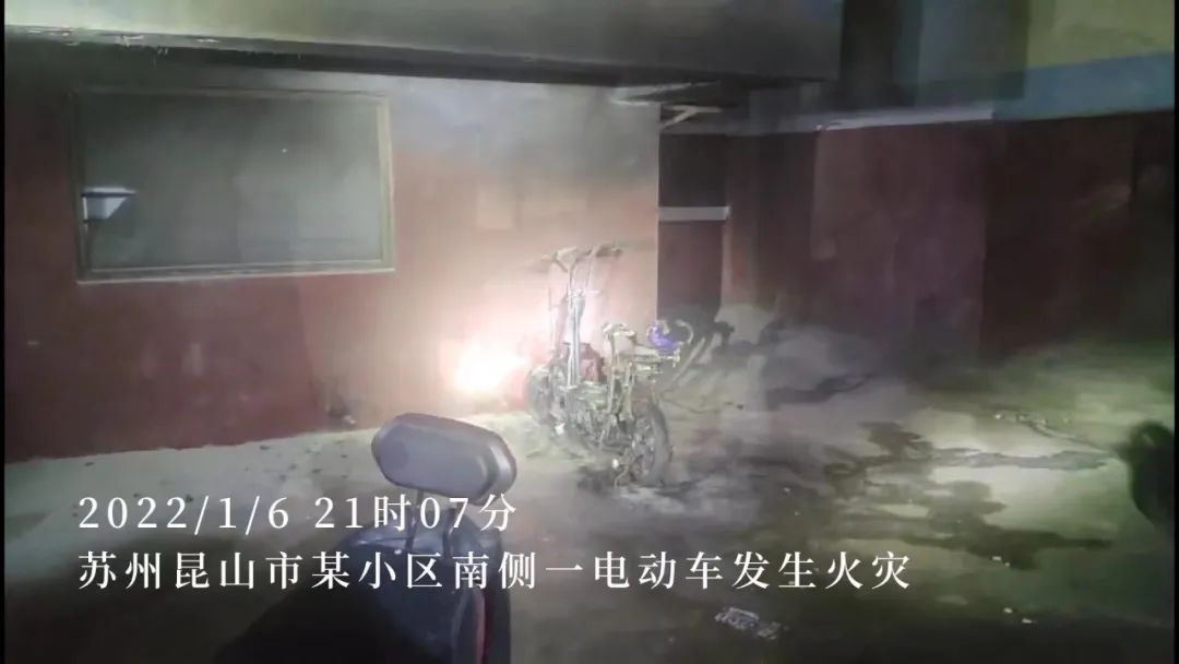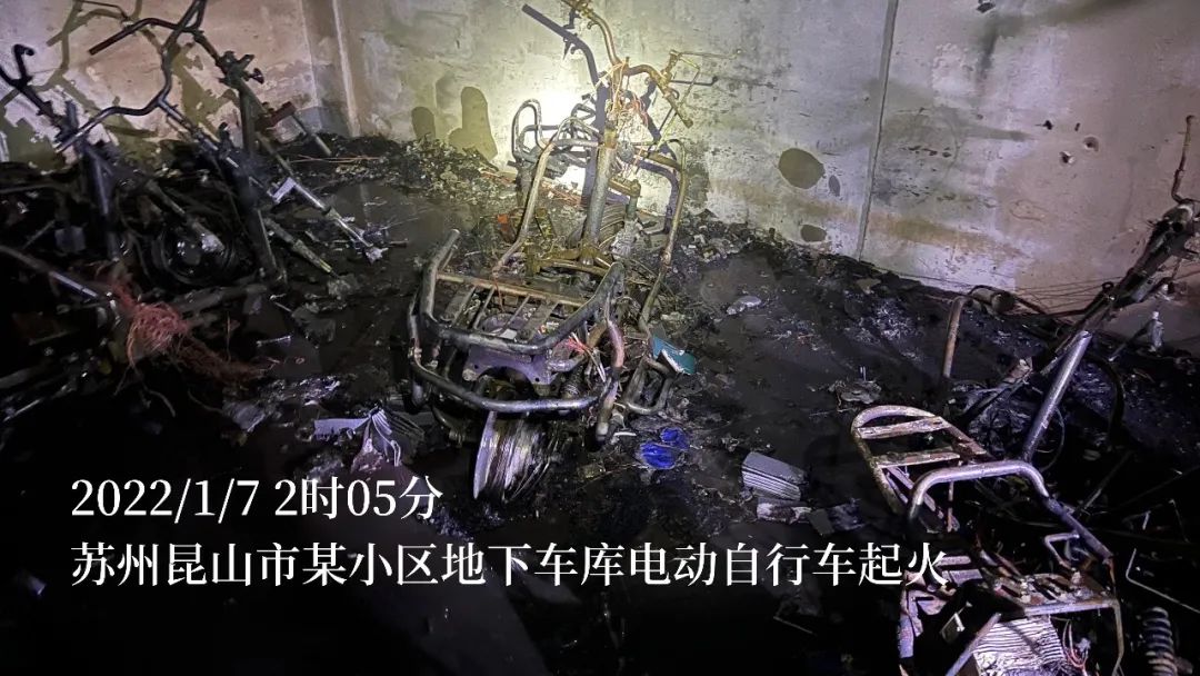 昆山市爱华路某小区南侧一辆电动自行车起火后波及另一辆,最终1辆完全烧毁,1辆部分烤化,现场无人员伤亡。