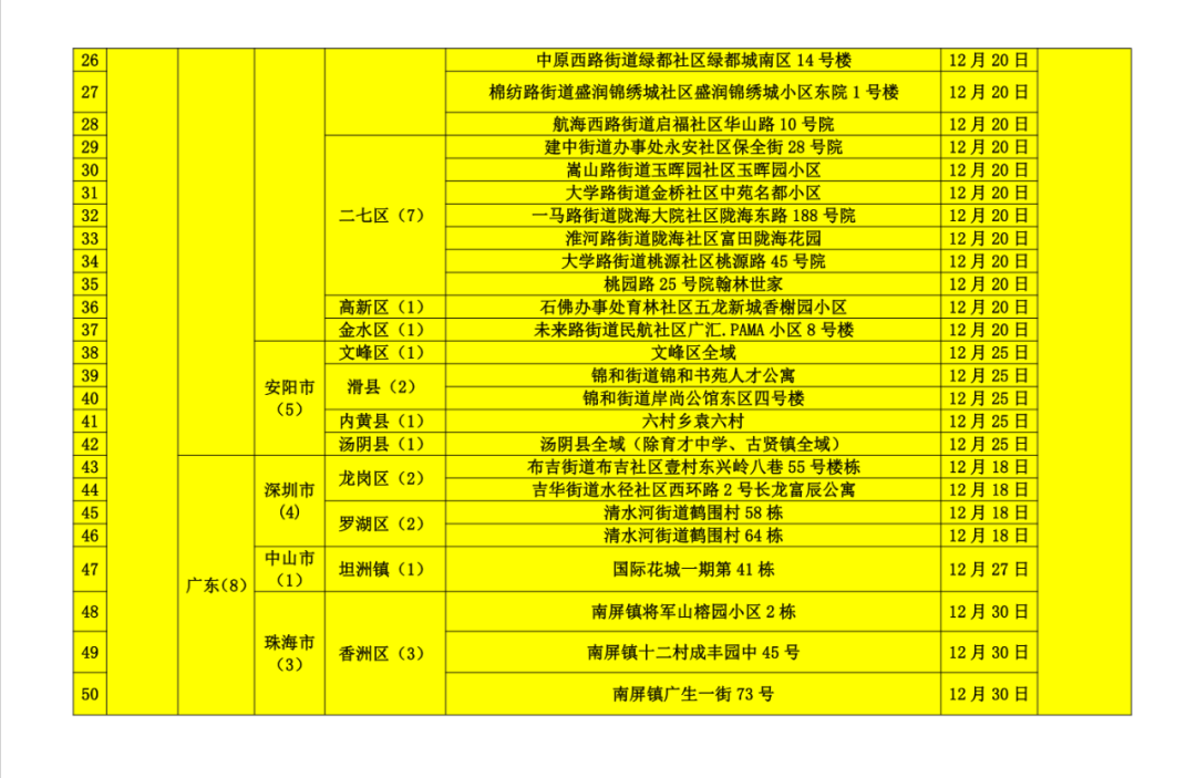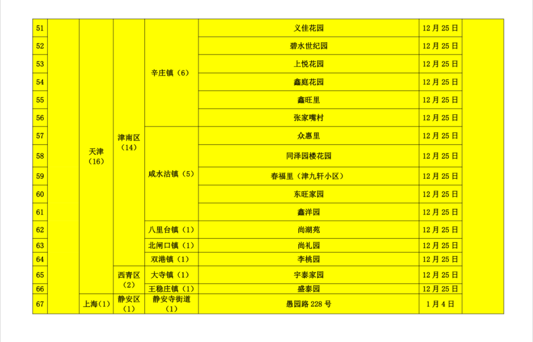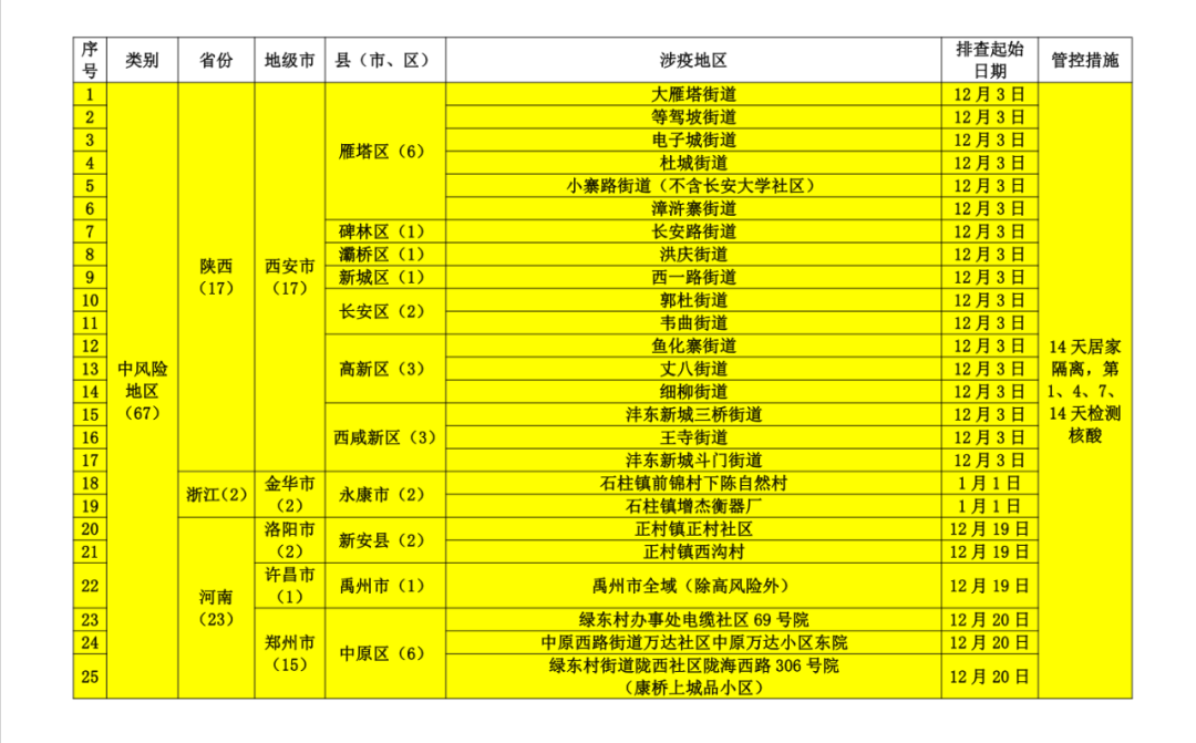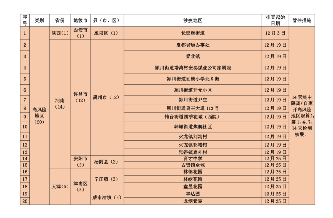 河南许昌禹州市(12月19日以来)和安阳汤阴县(12月25日以来)、天津津南区辛庄镇和咸水沽镇(12月25日以来),陕西西安市(12月3日以来)。