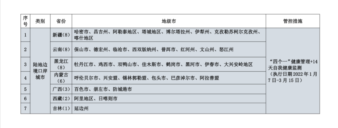 6. 【陆地边境口岸城市】来清(返)人员:2022年1月7日至3月15日,指定陆地边境口岸城市来清人员落实“四个一”健康管理+14天自我健康监测。