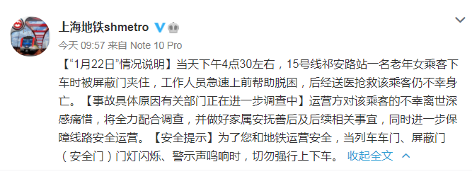 上海地铁女乘客被屏蔽门夹住不幸身亡,有关部门已介入
