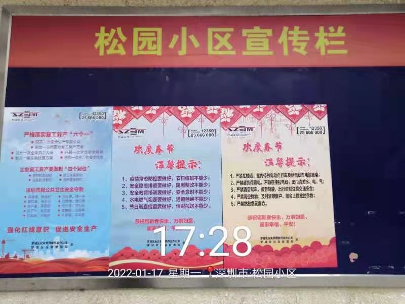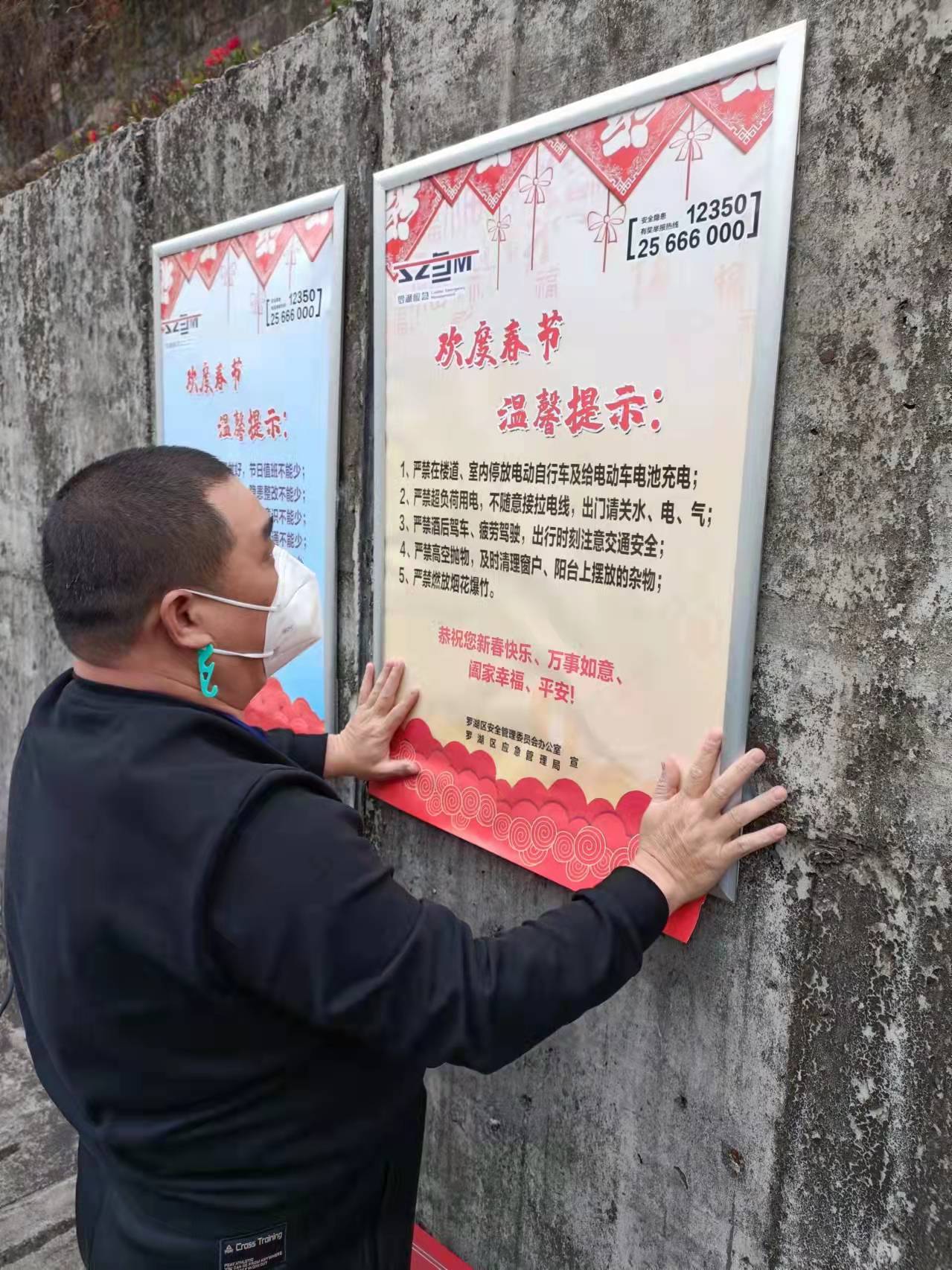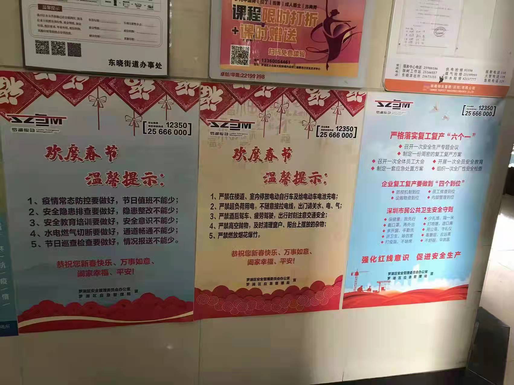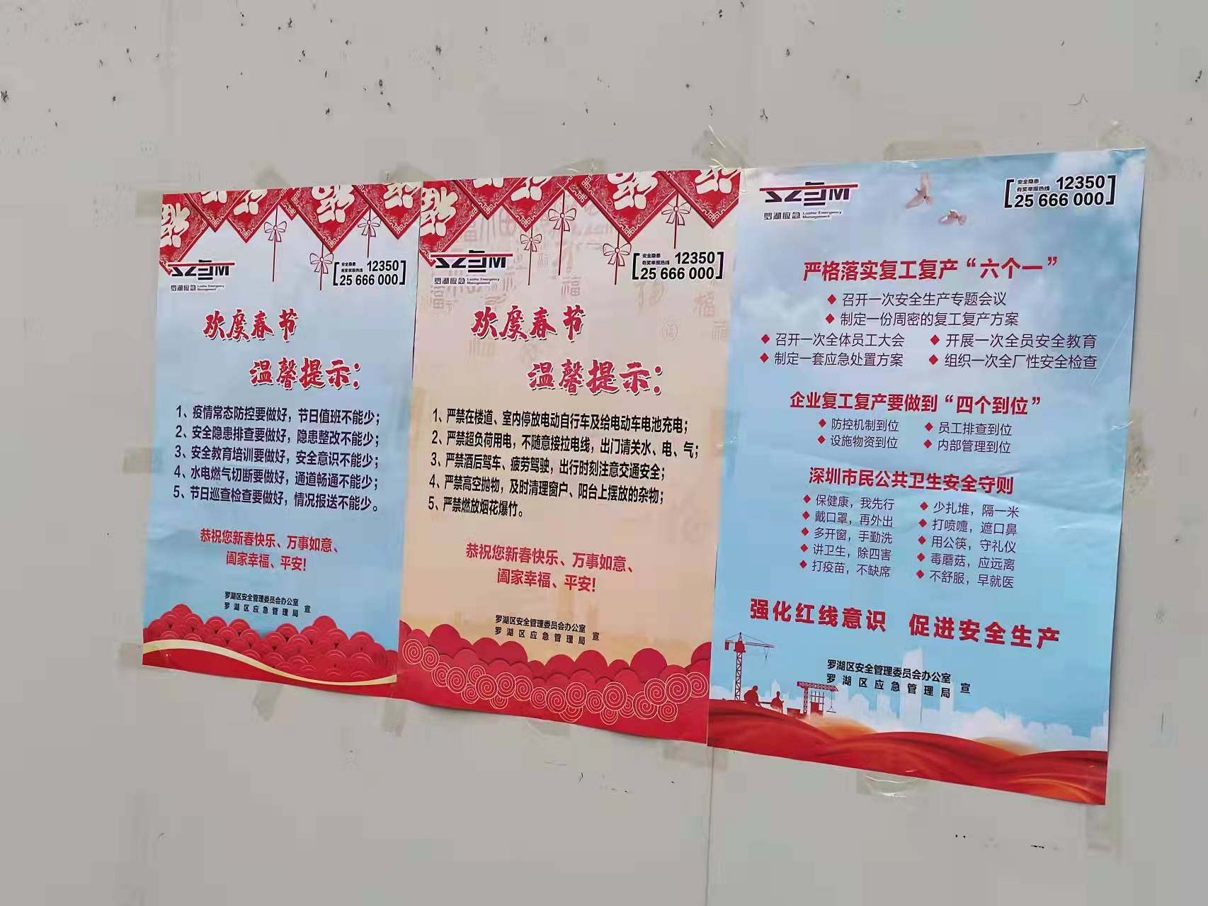 春节临近,为贯彻落实全国、全省、全市、全区春节安全防范工作要求,杜绝春节期间安全生产事故发生,扎实做好岁末年初安全生产工作,罗湖区应急管理局聚焦“欢度春节温馨提示、复产复工安全‘十条’”两大主题,印制三款安全宣传海报共计14000张,联合街道分别在辖区建筑工地、大型企业、商业场所、城中村等区域场所粘贴,以此加强春节期间的安全宣传,推进节后复工复产安全宣传工作,抓实、抓细、抓牢辖区的各项安全生产工作。