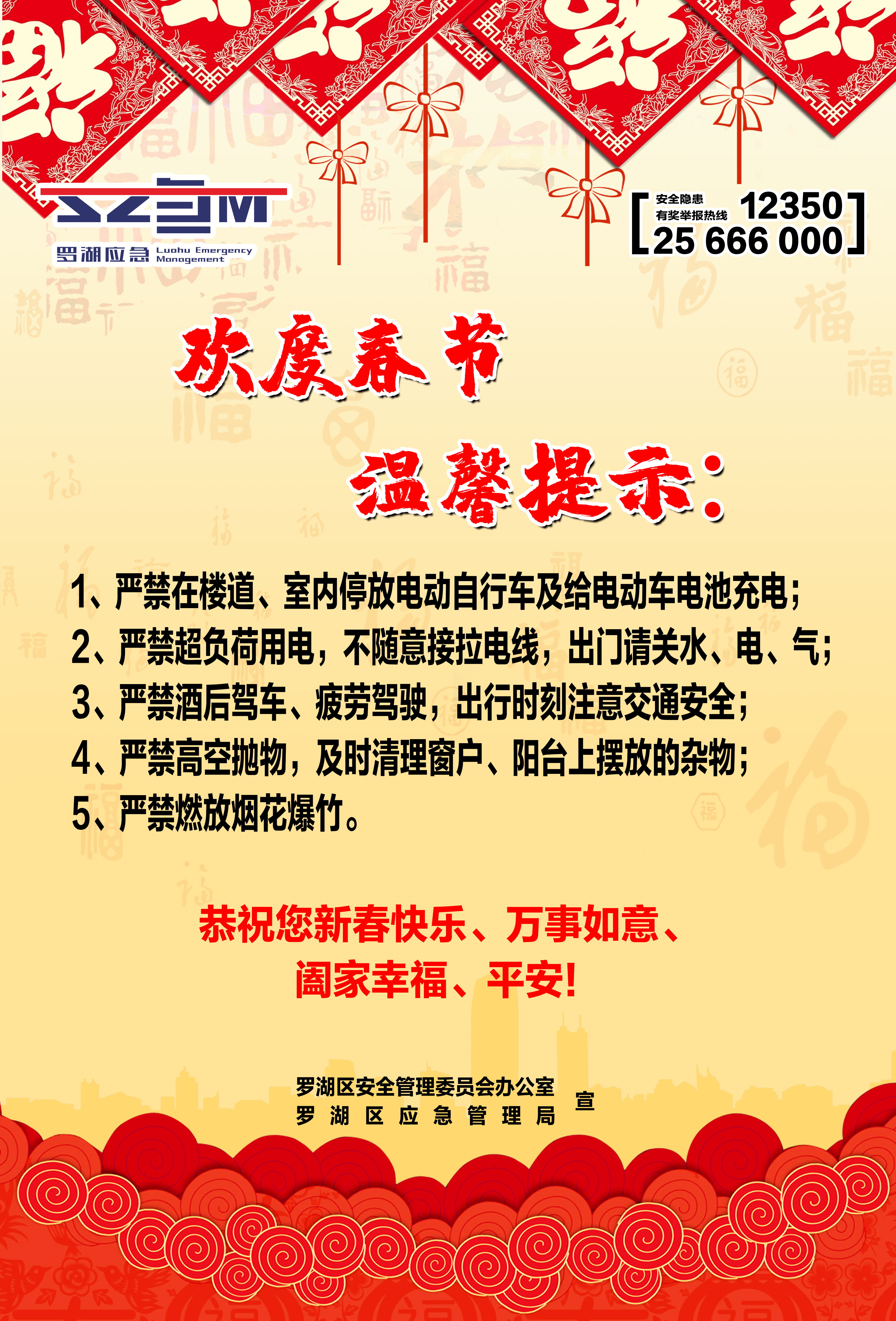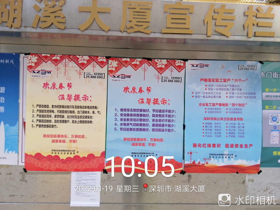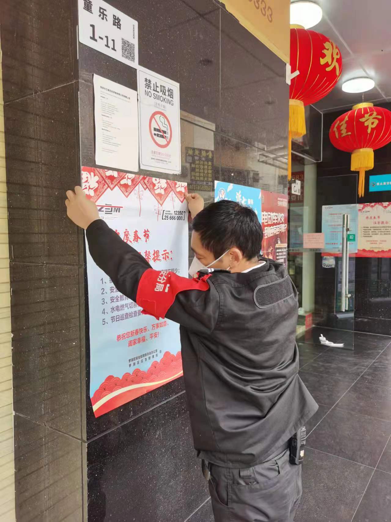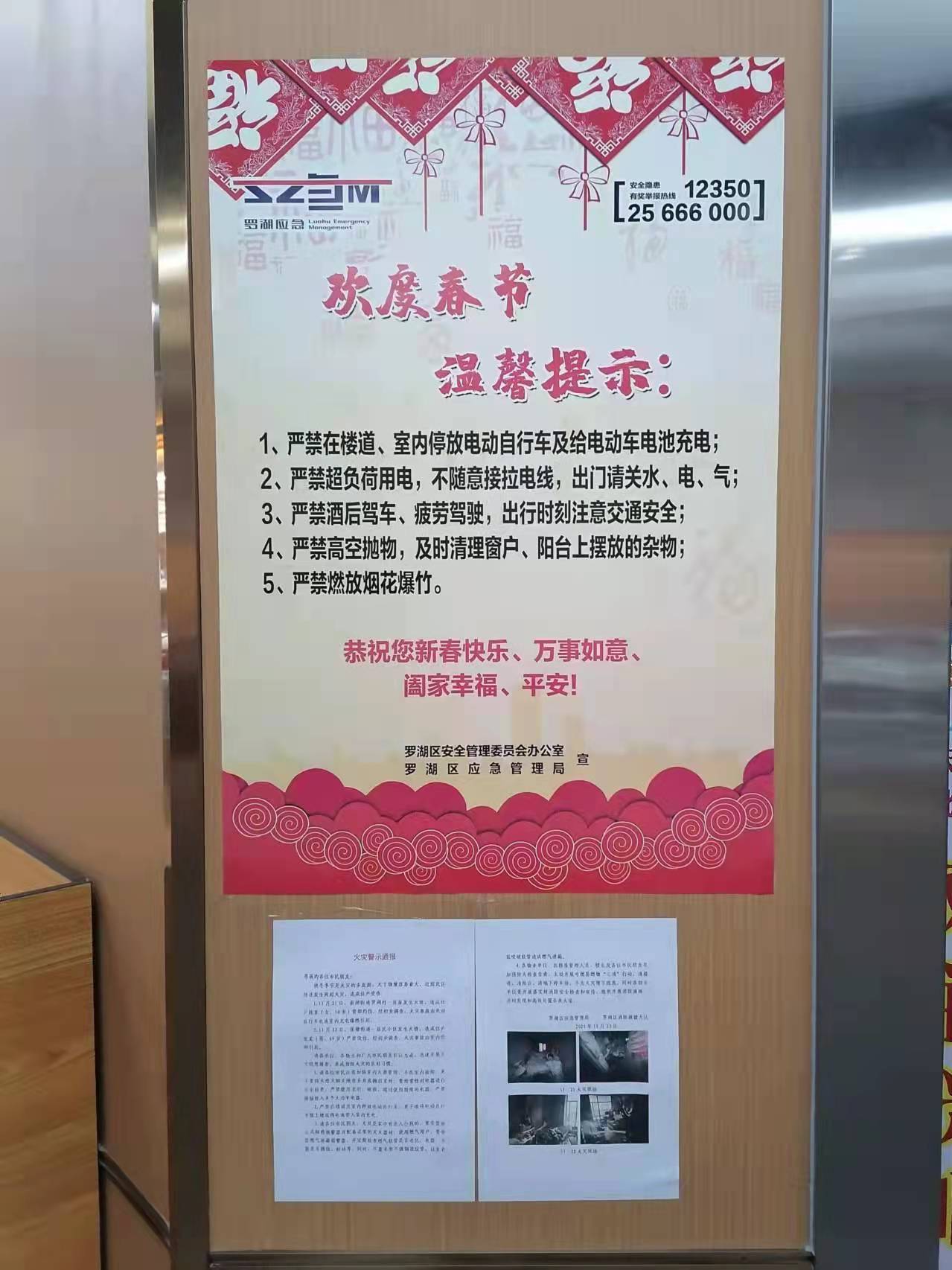 春节临近,为贯彻落实全国、全省、全市、全区春节安全防范工作要求,杜绝春节期间安全生产事故发生,扎实做好岁末年初安全生产工作,罗湖区应急管理局聚焦“欢度春节温馨提示、复产复工安全‘十条’”两大主题,印制三款安全宣传海报共计14000张,联合街道分别在辖区建筑工地、大型企业、商业场所、城中村等区域场所粘贴,以此加强春节期间的安全宣传,推进节后复工复产安全宣传工作,抓实、抓细、抓牢辖区的各项安全生产工作。
