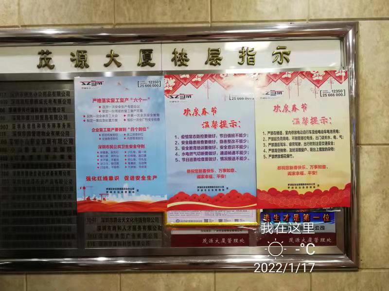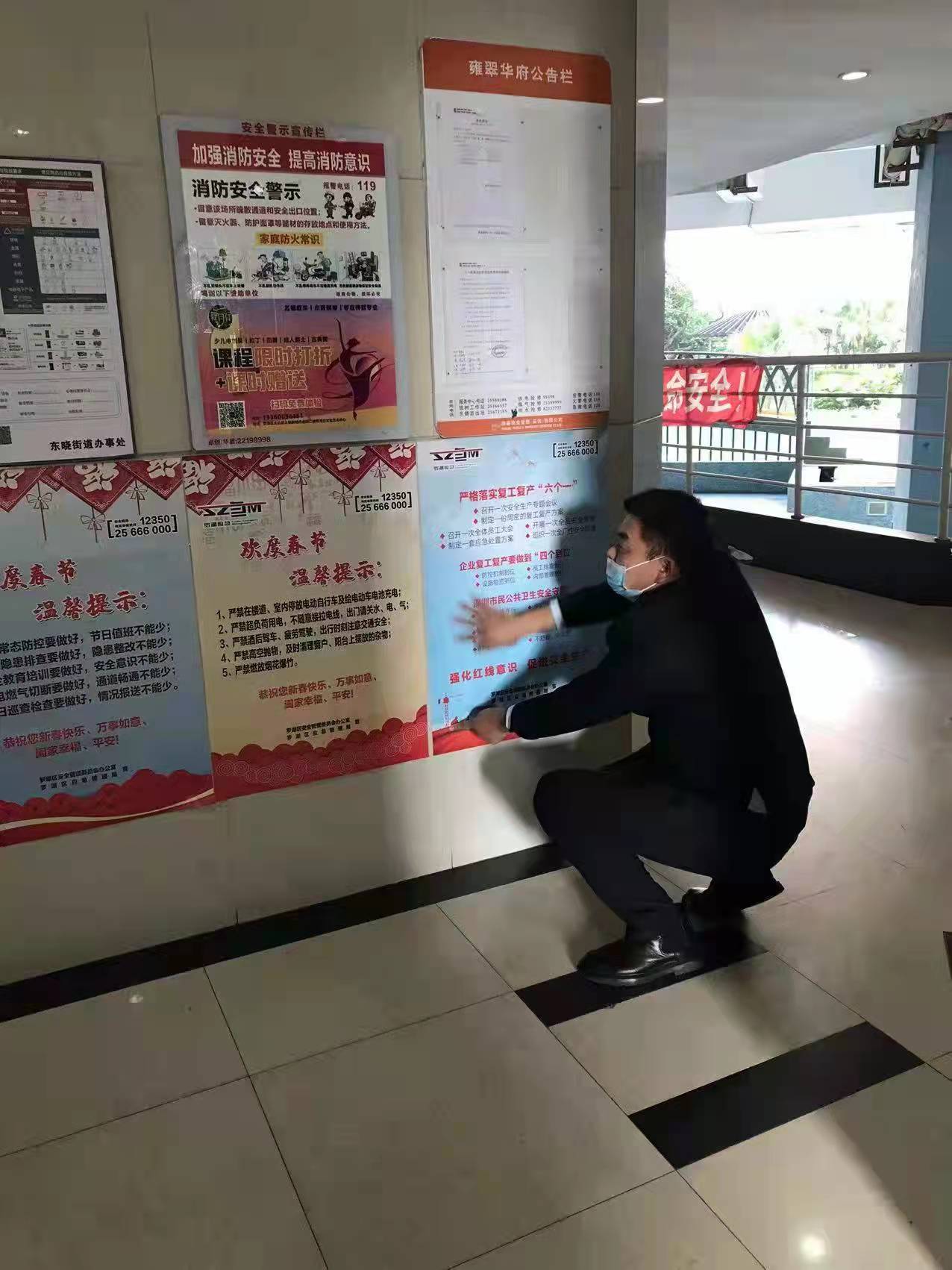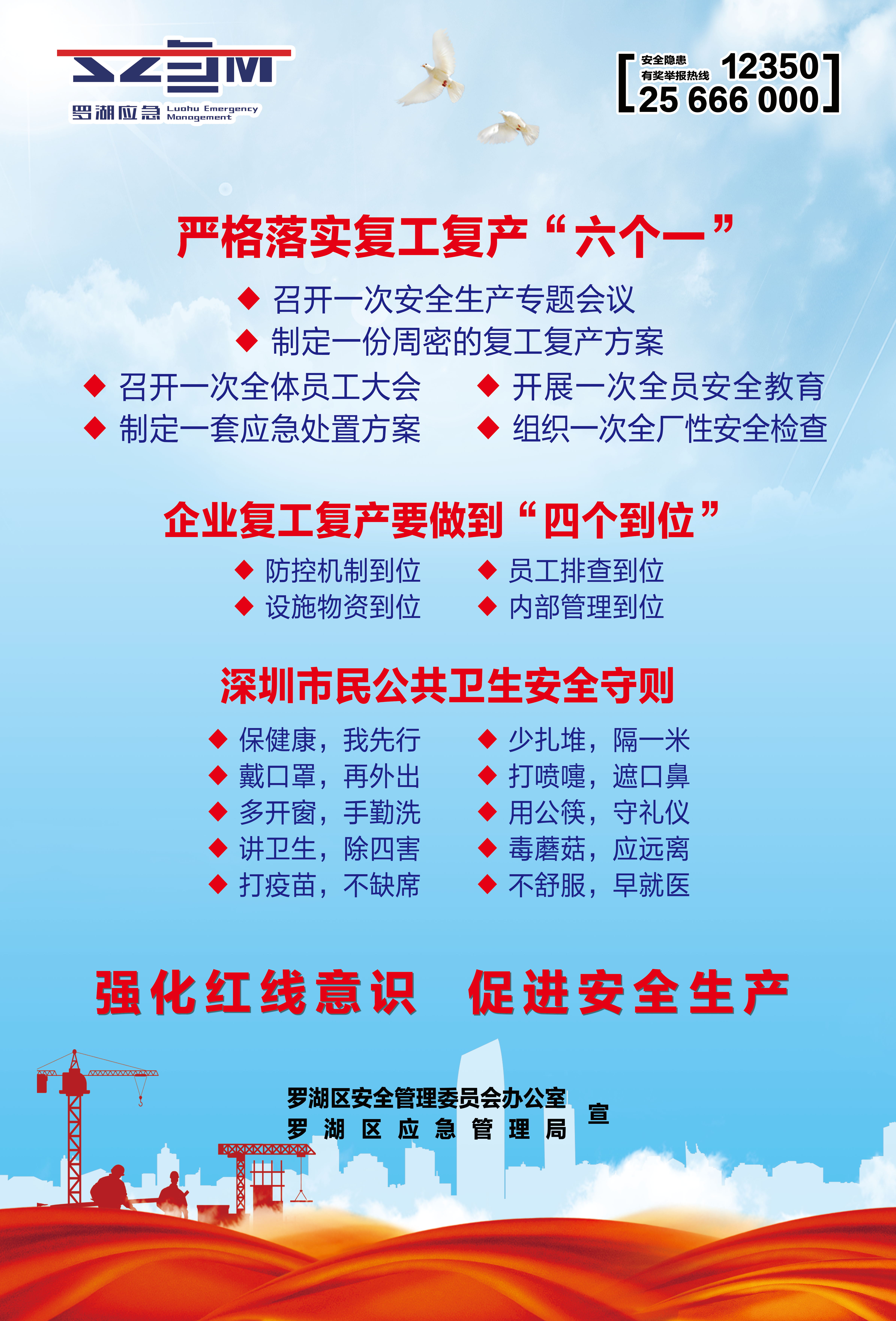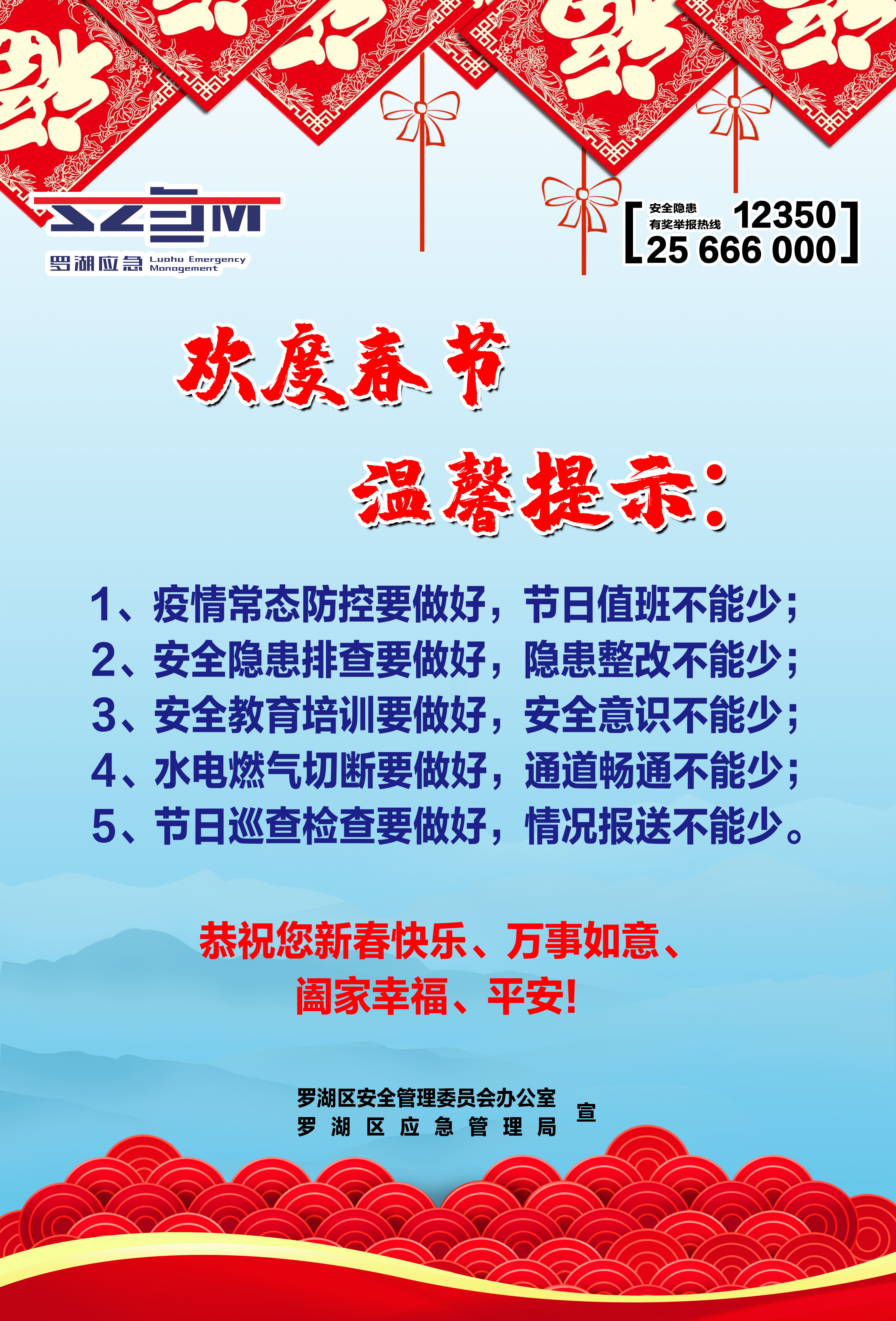 春节临近,为贯彻落实全国、全省、全市、全区春节安全防范工作要求,杜绝春节期间安全生产事故发生,扎实做好岁末年初安全生产工作,罗湖区应急管理局聚焦“欢度春节温馨提示、复产复工安全‘十条’”两大主题,印制三款安全宣传海报共计14000张,联合街道分别在辖区建筑工地、大型企业、商业场所、城中村等区域场所粘贴,以此加强春节期间的安全宣传,推进节后复工复产安全宣传工作,抓实、抓细、抓牢辖区的各项安全生产工作。