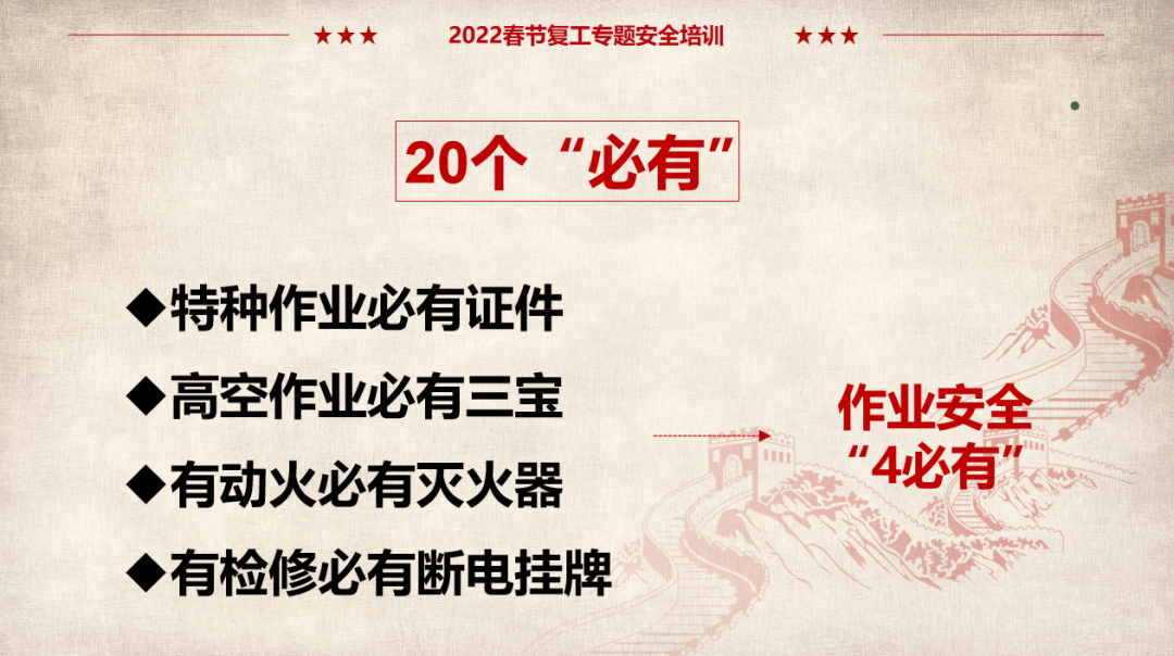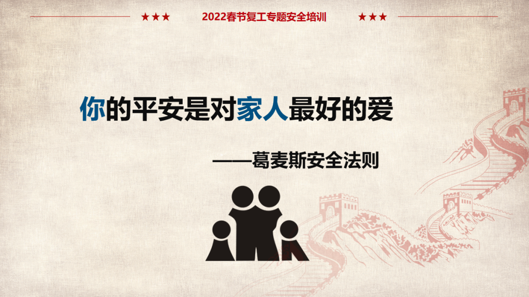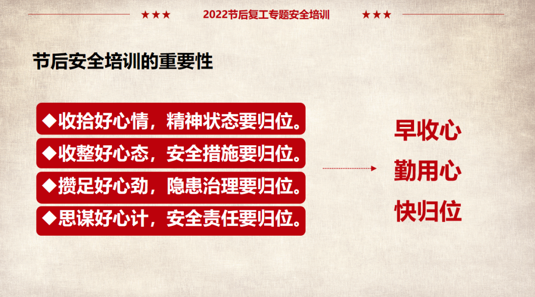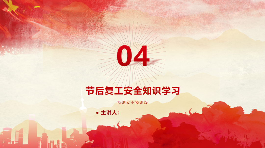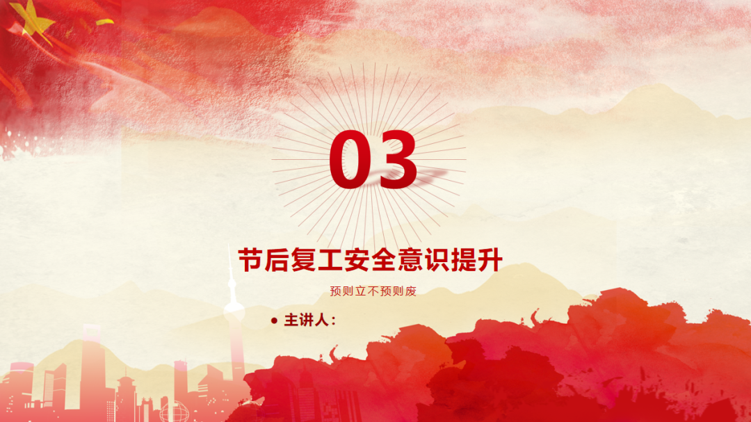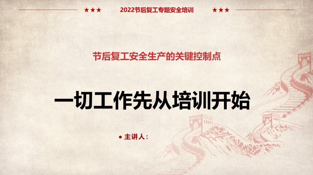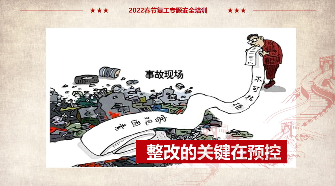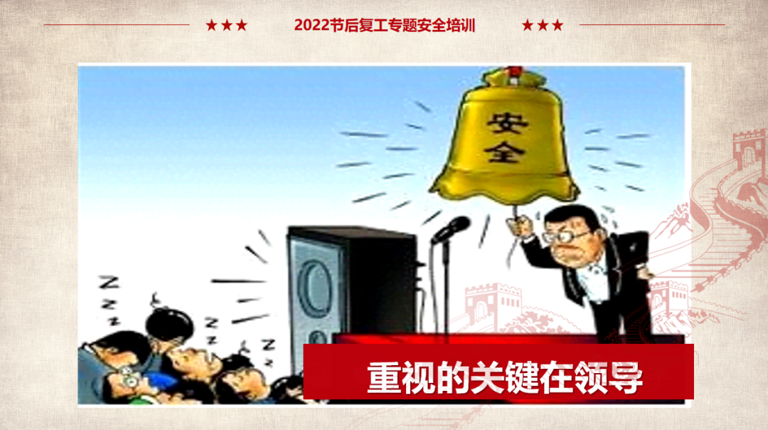 (以上仅为PTT部分页面,文末可下载完整PTT文件)组织开展岗位安全责任承诺,明确企业负责人、安全负责人、部门负责人、作业长、班组长、员工的安全责任,做到以岗定责、按责履职。树立“责任不落实是最大的隐患”的理念,自觉融入日常生产工作中,认真遵守各项安全管理规章制度。企业要对新入厂员工和转岗员工进行“三级”安全教育培训;要对节后返回原岗位工作的员工进行一次安全知识再教育再培训,唤醒返岗员工安全生产意识,提高安全操作技能,让员工心理意识从放假过渡到工作上来;要严格审核特种作业人员资格,确保持证上岗,对特种作业人员进行岗位安全教育。同时,针对员工可能出现的“假期综合症”带来的风险,要加以预防和控制,减少因人为操作失误引发的生产安全事故。班组是企业安全管理的基本单元,是安全管理的“前沿阵地”,抓好班组安全建设至关重要。各单位要组织、指导和督促生产班组开展一次安全专题班前会,班组长带领班组成员作出安全承诺,开展交心谈话,了解节后大家的身体和心理状态,一起分析工作中面临的风险,相互提醒,自觉做到“四不伤害”。企业应在复工前对各类起重机械、生产车辆、动力管线、电气设备、手动工具进行全面检查、检修、检测,确保设备设施正常、安全运行。加强对脚手架、高处和临边孔洞安全防护、支撑防护、通风照明、应急通道等进行检查,确保安全可靠。应根据自身实际,彻底排查现场隐患,有效预防各类事故发生。企业管理人员应多到现场检查设备设施安全运行情况,加强员工劳动防护用品的正确佩戴和使用情况检查、监督,并与员工加强沟通交流,及时了解员工的思想状况。同时,企业节后复工复产进行线路检修、清洁卫生时要督促员工注意加强安全防护。清洗化粪池、污水池、罐体等有限空间要严格执行有限空间有关规定;特别是禁止违规使用天那水、白电油等易燃易爆有机溶剂擦洗地板、清洁机器,避免引起火灾事故,如必须使用,则须经过审批,并严格做好防护措施。一线执法人员要加强安全生产执法巡查,督促企业落实安全生产主体责任,确保复工复产安全;同时深入企业,指导督促企业加强安全管理,对存在安全隐患不满足开工条件的,要严格按照法律法规予以查处;各生产企业要结合节后安全生产工作特点,开展形式多样的安全生产宣传和教育培训活动,提高各类从业人员的安全防范意识和能力,预防安全事故发生。利用班前会和安全例会,以节日期间值班员工认真坚守岗位为榜样,教育员工尽快把心收回来,尽快收拾心情,全身心投入工作,让节日里蓄积的能量充分发挥到工作中,以崭新的面貌面对接下来的工作。用责任收心即要以对工作高度的责任心来约束自己,将思想统一至接下来的工作部署上来,将心收到各自的岗位上来。每个员工都要认真负责抓好每一项工作落实,更要把握过程、规范管理、执行到位。而这些,都需要我们振奋精神,投入百倍努力推进工作开展,不能有一丝懈怠、一分懒惰。单位领导要引导每个员工理清思路、尽早打算、统筹安排、务实工作,既要认真思考、周密安排,又要将各项工作措施尽早启动、及早推进、赶早努力、务求实效,才不会延误接下来的工作进展,才会使工作呈现出新的气象,使接下来工作再上一个台阶。节假日前后由于员工思节度假人心涣散、精力不集中,往往是造成各种事故的根源,要利用本单位或外单位类似的事故案例,进行警示教育,提醒人们做好安全工作,重视生产安全通过各类安全教育工具、平台进行安全教育,或是开展安全体验。来源:广东安全生产杂志