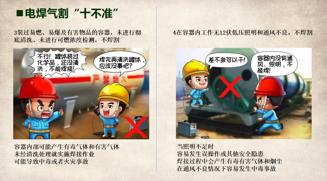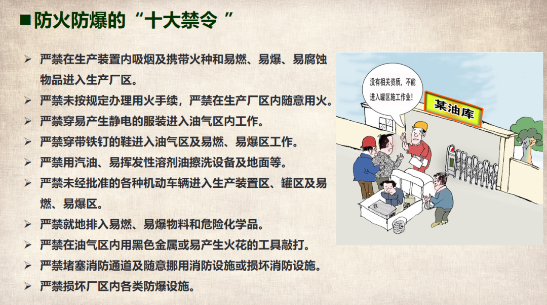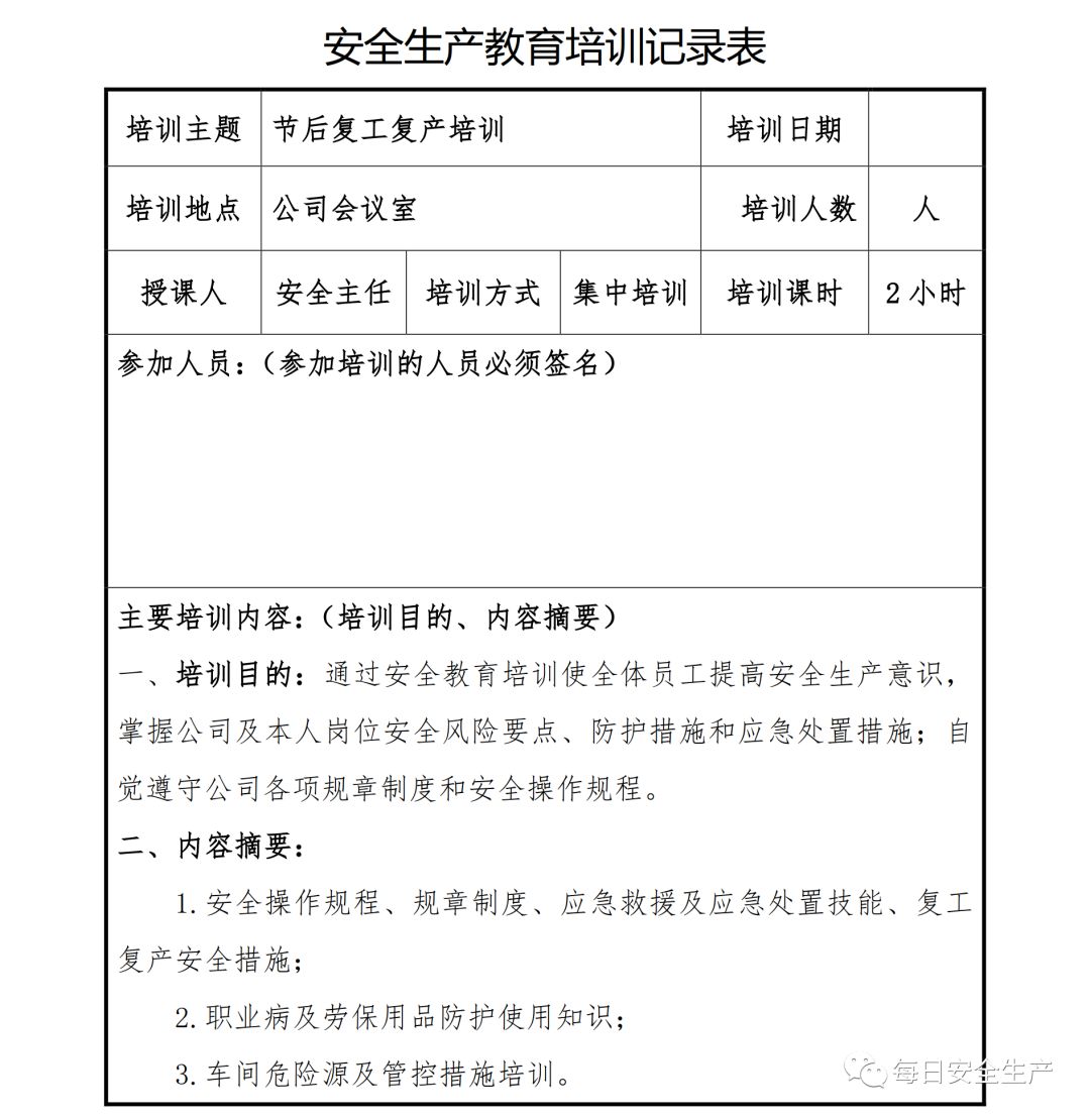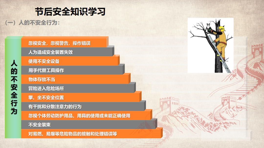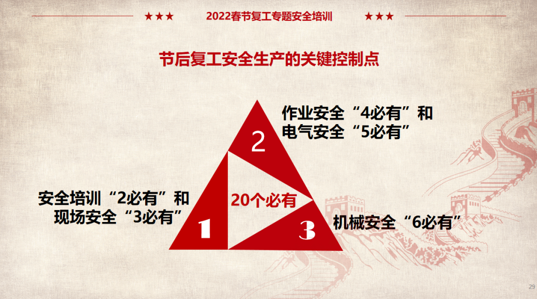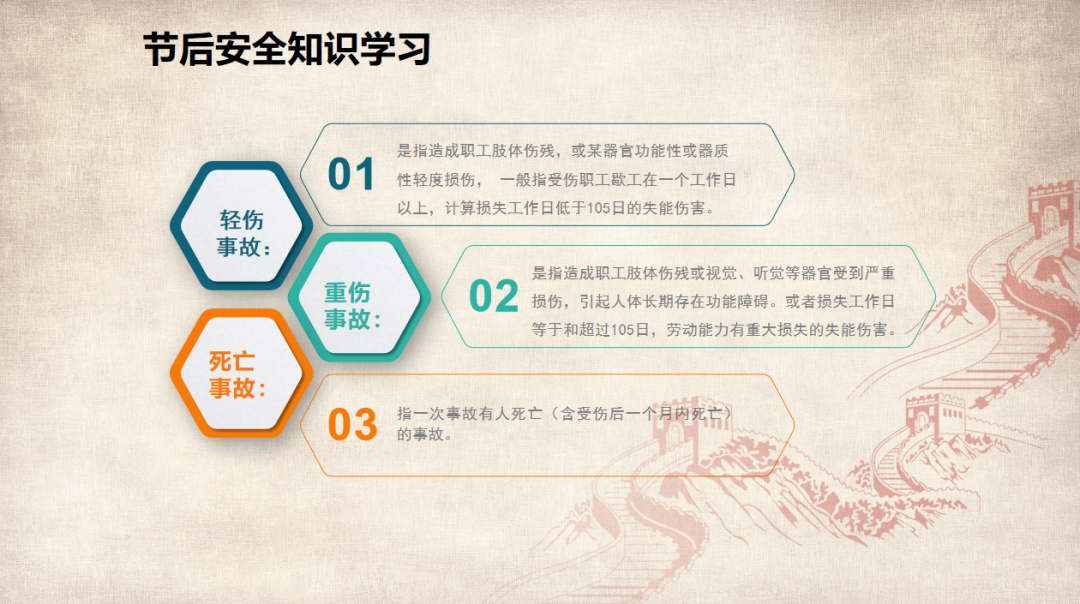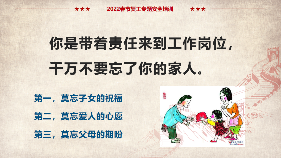 (以上仅为PTT部分页面,文末可下载完整PTT文件)组织开展岗位安全责任承诺,明确企业负责人、安全负责人、部门负责人、作业长、班组长、员工的安全责任,做到以岗定责、按责履职。树立“责任不落实是最大的隐患”的理念,自觉融入日常生产工作中,认真遵守各项安全管理规章制度。企业要对新入厂员工和转岗员工进行“三级”安全教育培训;要对节后返回原岗位工作的员工进行一次安全知识再教育再培训,唤醒返岗员工安全生产意识,提高安全操作技能,让员工心理意识从放假过渡到工作上来;要严格审核特种作业人员资格,确保持证上岗,对特种作业人员进行岗位安全教育。同时,针对员工可能出现的“假期综合症”带来的风险,要加以预防和控制,减少因人为操作失误引发的生产安全事故。班组是企业安全管理的基本单元,是安全管理的“前沿阵地”,抓好班组安全建设至关重要。各单位要组织、指导和督促生产班组开展一次安全专题班前会,班组长带领班组成员作出安全承诺,开展交心谈话,了解节后大家的身体和心理状态,一起分析工作中面临的风险,相互提醒,自觉做到“四不伤害”。企业应在复工前对各类起重机械、生产车辆、动力管线、电气设备、手动工具进行全面检查、检修、检测,确保设备设施正常、安全运行。加强对脚手架、高处和临边孔洞安全防护、支撑防护、通风照明、应急通道等进行检查,确保安全可靠。应根据自身实际,彻底排查现场隐患,有效预防各类事故发生。企业管理人员应多到现场检查设备设施安全运行情况,加强员工劳动防护用品的正确佩戴和使用情况检查、监督,并与员工加强沟通交流,及时了解员工的思想状况。同时,企业节后复工复产进行线路检修、清洁卫生时要督促员工注意加强安全防护。清洗化粪池、污水池、罐体等有限空间要严格执行有限空间有关规定;特别是禁止违规使用天那水、白电油等易燃易爆有机溶剂擦洗地板、清洁机器,避免引起火灾事故,如必须使用,则须经过审批,并严格做好防护措施。一线执法人员要加强安全生产执法巡查,督促企业落实安全生产主体责任,确保复工复产安全;同时深入企业,指导督促企业加强安全管理,对存在安全隐患不满足开工条件的,要严格按照法律法规予以查处;各生产企业要结合节后安全生产工作特点,开展形式多样的安全生产宣传和教育培训活动,提高各类从业人员的安全防范意识和能力,预防安全事故发生。利用班前会和安全例会,以节日期间值班员工认真坚守岗位为榜样,教育员工尽快把心收回来,尽快收拾心情,全身心投入工作,让节日里蓄积的能量充分发挥到工作中,以崭新的面貌面对接下来的工作。用责任收心即要以对工作高度的责任心来约束自己,将思想统一至接下来的工作部署上来,将心收到各自的岗位上来。每个员工都要认真负责抓好每一项工作落实,更要把握过程、规范管理、执行到位。而这些,都需要我们振奋精神,投入百倍努力推进工作开展,不能有一丝懈怠、一分懒惰。单位领导要引导每个员工理清思路、尽早打算、统筹安排、务实工作,既要认真思考、周密安排,又要将各项工作措施尽早启动、及早推进、赶早努力、务求实效,才不会延误接下来的工作进展,才会使工作呈现出新的气象,使接下来工作再上一个台阶。节假日前后由于员工思节度假人心涣散、精力不集中,往往是造成各种事故的根源,要利用本单位或外单位类似的事故案例,进行警示教育,提醒人们做好安全工作,重视生产安全通过各类安全教育工具、平台进行安全教育,或是开展安全体验。来源:广东安全生产杂志