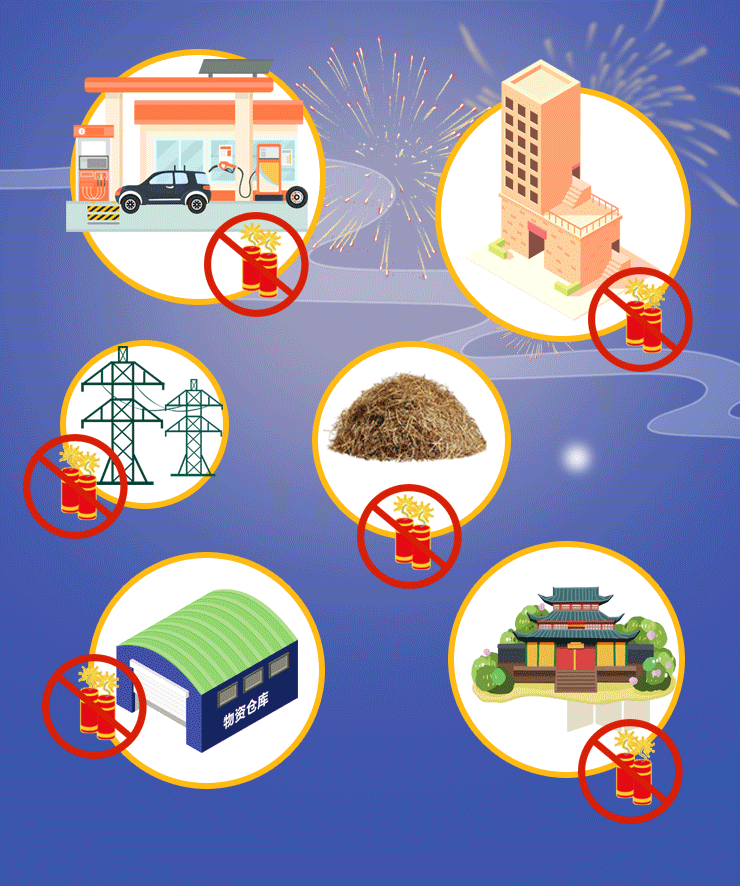 购买烟花爆竹要选用合格产品。在指定地点安全燃放,严禁在加油站等易燃易爆场所、重要物资仓库、文物建筑、居民住宅区、柴草堆垛、高压线附近燃放。