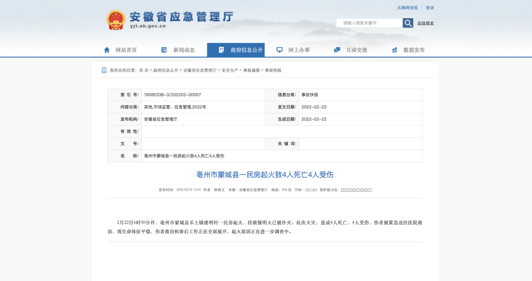 据安徽省应急管理厅消息,2月22日6时50分许,亳州市蒙城县乐土镇建明村一民房起火,经救援明火已被扑灭。此次火灾,造成5人死亡,4人受伤,伤者被紧急送往医院救治,现生命体征平稳,伤者救治和善后工作正在全面展开,起火原因正在进一步调查中。