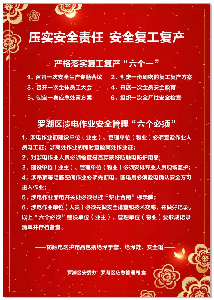 复工复产安全宣传方面,罗湖区应急管理局印制《压实安全责任安全复工复产》宣传海报10000余份,并张贴到辖区生产经营单位及相关场所醒目位置,以此提高企业对复工复产“六个一”、涉电作业安全管理“六个必须”认知水平。