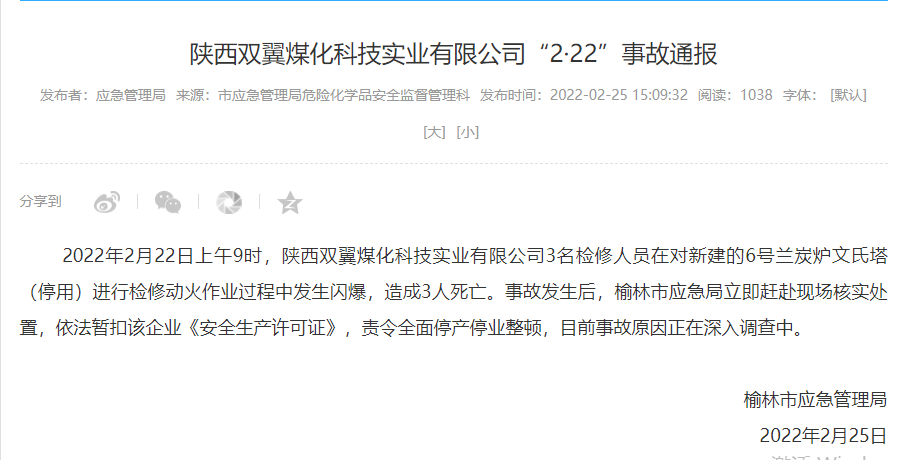 事故发生后,榆林市应急局立即赶赴现场核实处置,依法暂扣该企业《安全生产许可证》,