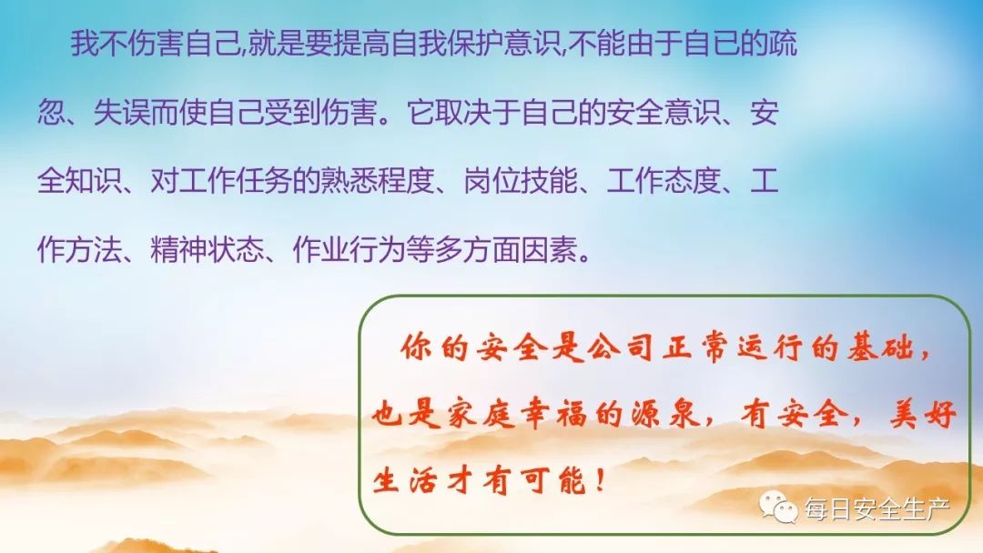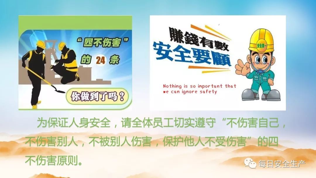 工作就意味着安全责任,无论是谁,一旦发生事故必然牵涉到自己、他人和集体。这就有了我们要求的“不伤害自己,不伤害别人,不被别人伤害,不让他人受到伤害”。