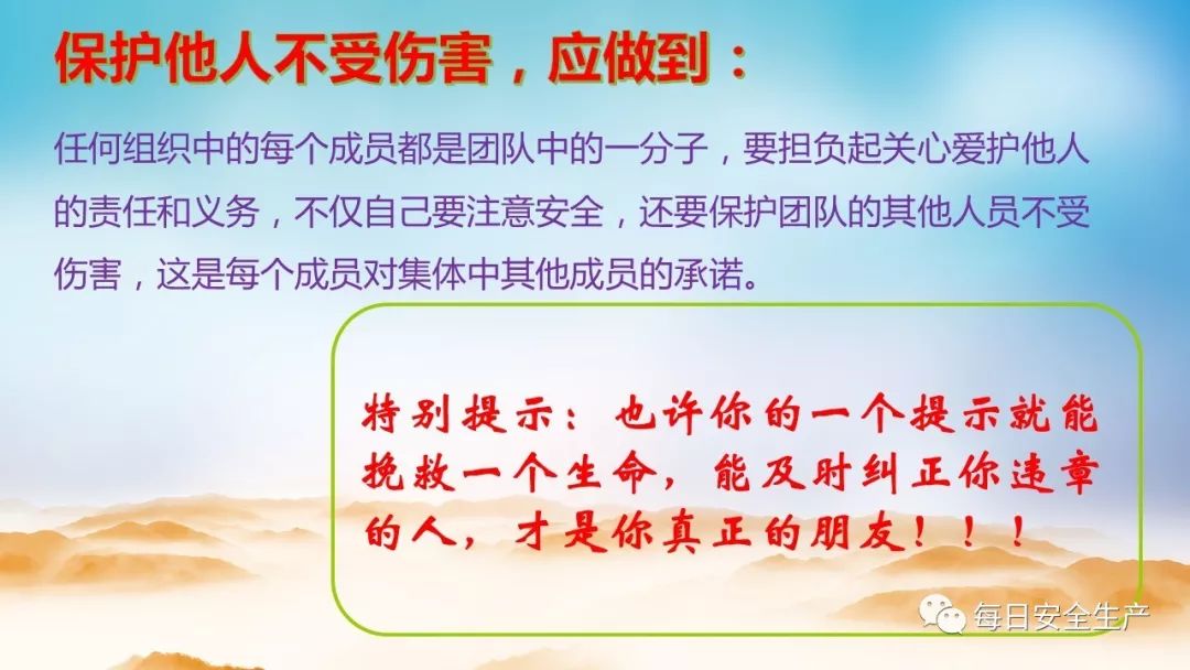 在企业生产中,每一个成员都是团队一分子,要担负起关心爱护他人的责任和义务,安全不仅仅是一个人的事,也是团队的事,不仅自己要注意安全,还要保护团队其他成员不受伤害。