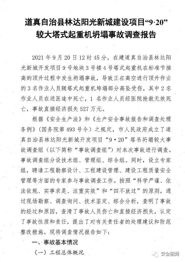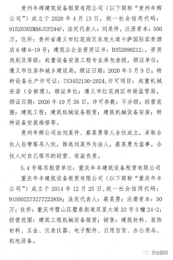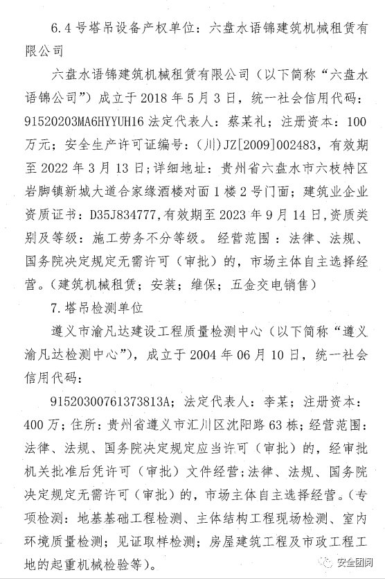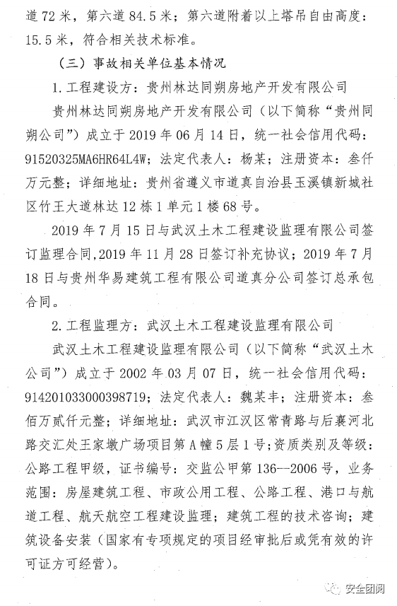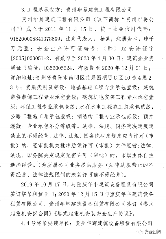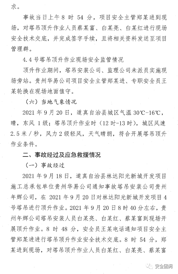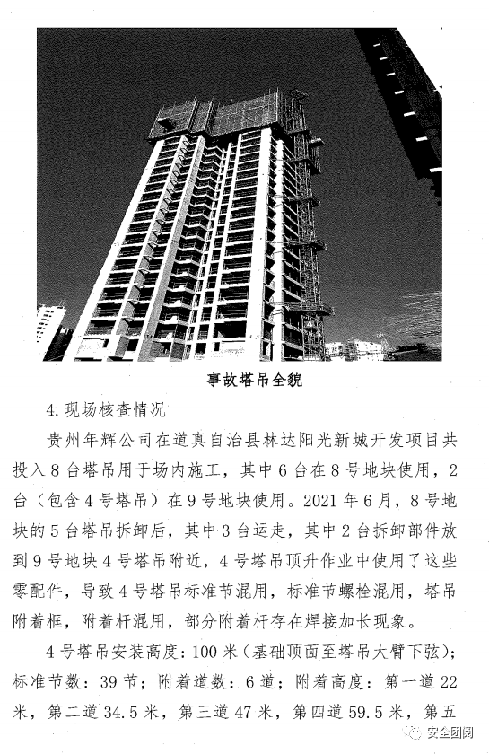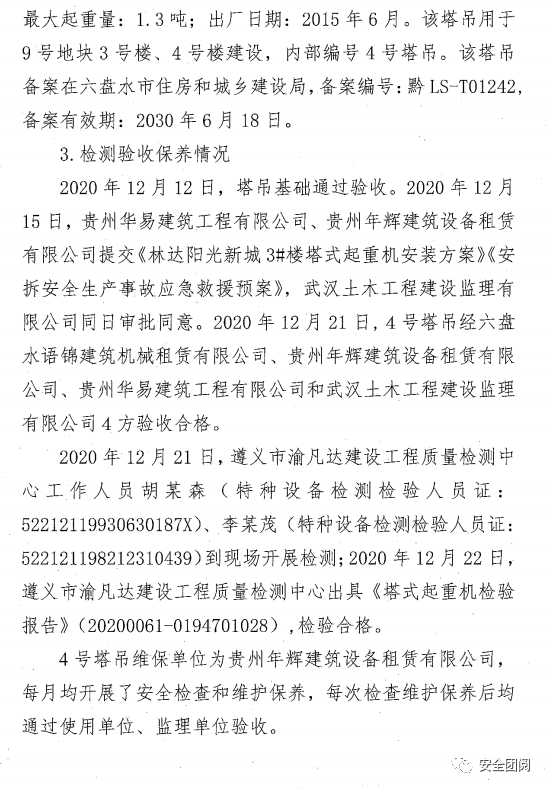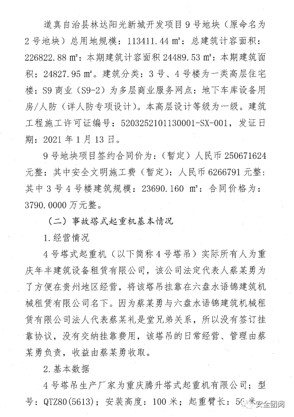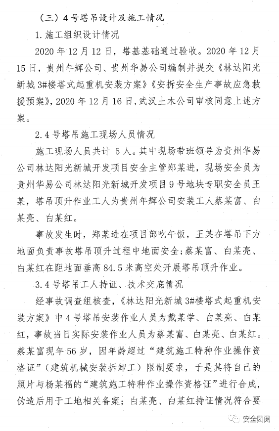 蔡某富、白某亮、白某红,3人均为4号塔吊顶升作业工人。安全意识淡薄,违章作业,冒险蛮干,未按照施工方案和技术交底要求进行施工,对本次事故负有直接责任,应移交司法机关处理,鉴于已在本次事故中死亡,建议对蔡某富、白某亮、白某红免于责任追究。1.蔡某勇,男,贵州年辉公司监事、道真自治县林达阳光新城开发项目塔吊安拆项目负责人、4号塔吊实际所有人、4号塔吊安拆负责人。未按要求安排安全人员在塔吊顶升作业现场旁站,安排塔吊顶升作业人员数量、资质不符合相关规范和要求,现场管理混乱导致塔吊零部件混用。其行为违反了《中华人民共和国安全生产法》第二十一条之规定,涉嫌构成安全生产类犯罪,建议移交司法机关依法追究其刑事责任。2.王某,男,贵州华易公司林达阳光新城开发项目9号地块专职安全员,负责3号4号楼建设安全。在明知监理、安装公司安全监管人员未到场,塔吊顶升作业人员数量、资质不符合相关规范和要求的情况下,未立即停止顶升作业。其行为违反了《中华人民共和国安全生产法》第二十五条之规定,涉嫌构成安全生产类犯罪,建议移交司法机关依法追究其刑事责任。3.郑某进,男,贵州华易公司林达阳光新城开发项目安全主管,在明知监理、安装公司安全监管人员未到场,塔吊顶升作业人员数量、资质不符合相关规范和要求的情况下,未立即停止顶升作业。其行为违反了《中华人民共和国安全生产法》第二十五条之规定,涉嫌安全生产类犯罪,建议移交司法机关依法追究其刑事责任。4.李某恩,男,武汉土木公司正安分公司负责人,武汉土木公司林达阳光新城开发项目总监理工程师。长期不到项目现场履行总监职责,对项目专业监理工程师长期缺位现象视而不见,未按照《建设工程监理规范》相关要求正确履行监理职责,其行为违反了《建设工程安全生产管理条例》第十四条之规定,涉嫌安全生产类犯罪,建议移交司法机关依法追究其刑事责任。华中科技大学土木工程学院余群舟教授认为,塔吊事故隐患多种多样,如倒塌、塔臂折断、触碰事故(如塔吊触碰高压线)、构件脱落、吊物坠落、工人事故等。其中,机体倾覆、高处坠落、吊物坠落砸人三种类型的事故占事故总起数的89%。塔吊的常见事故主要有以下几类: